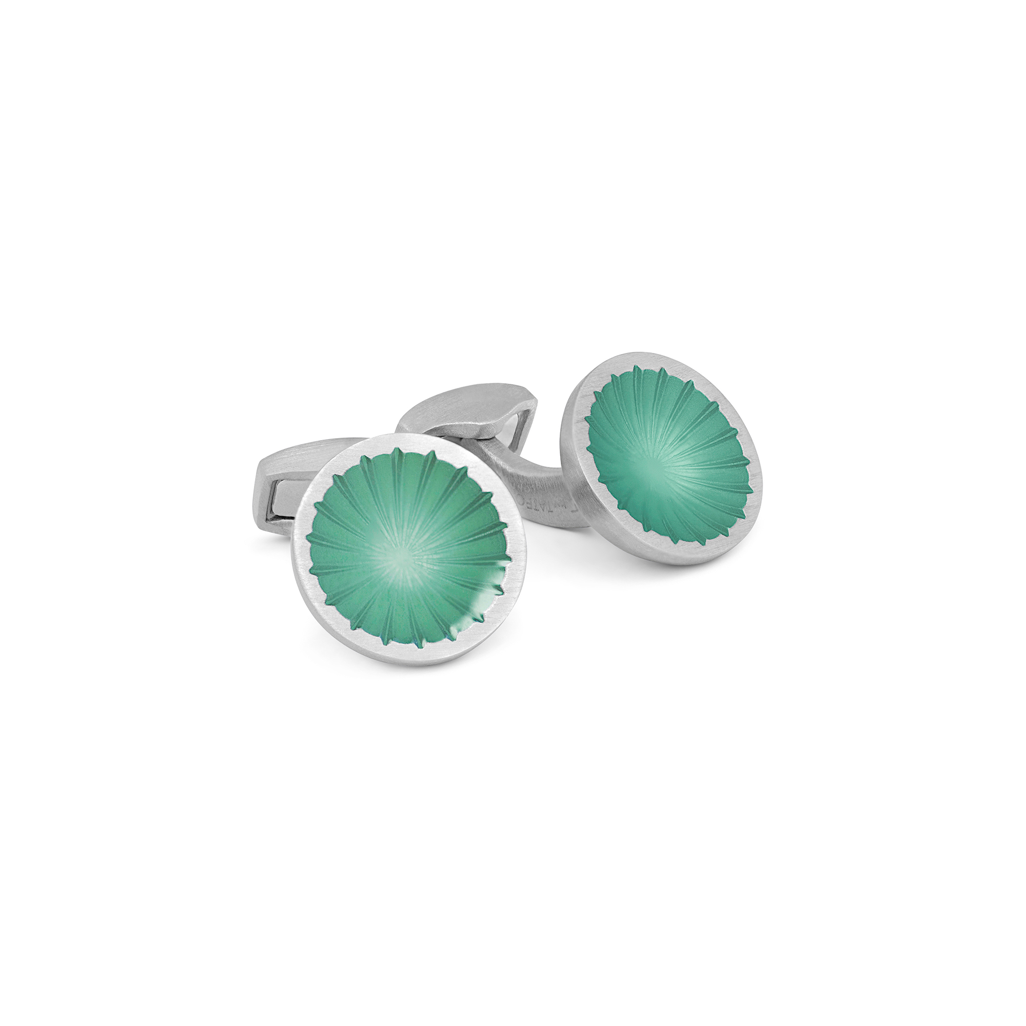 An exquisite cufflink by Tateossian, featuring a palladium-plated base metal for a sleek, polished finish. The rounded case encases a striking green enamel in a mesmerizing starburst pattern, adding a touch of refined elegance. Designed for the discerning gentleman, this luxurious accessory seamlessly blends contemporary craftsmanship with timeless sophistication—an ideal complement to any high-end wardrobe.