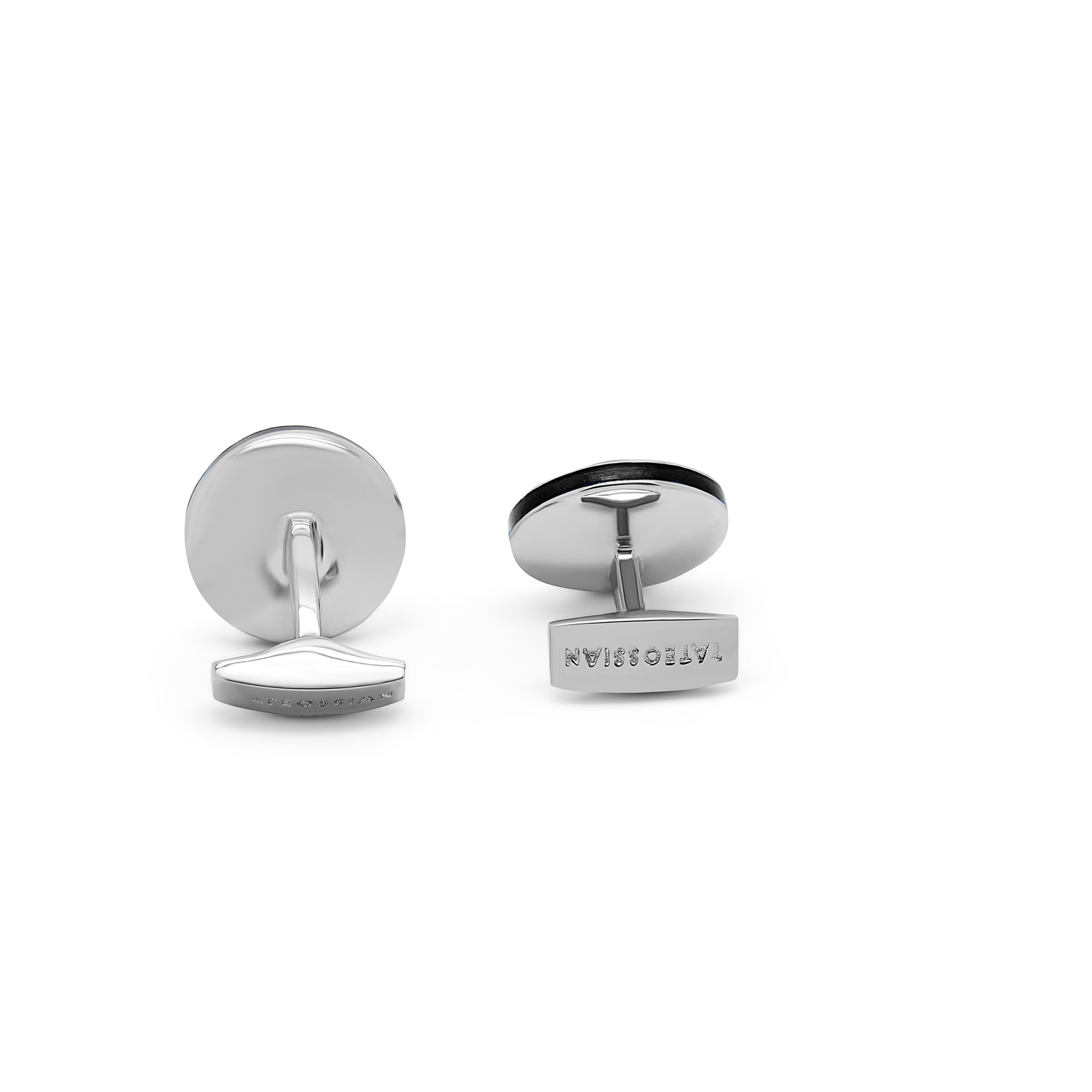 A refined fusion of texture and elegance, these Tateossian cufflinks feature a striking onyx stone, set within a meticulously engraved diamond-patterned rhodium-plated sterling silver case. The intricate engraving adds depth and sophistication, beautifully complementing the sleek, polished surface of the onyx. A black enamel ring along the side of the case provides a bold contrast, enhancing the cufflinks’ modern yet timeless appeal. Designed for the discerning gentleman, this luxurious accessory delivers a distinguished finishing touch to any formal ensemble.