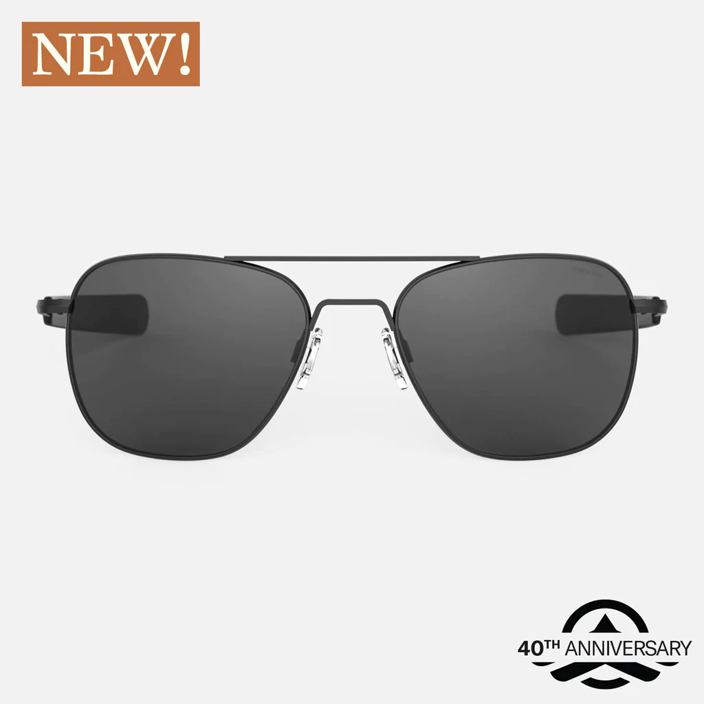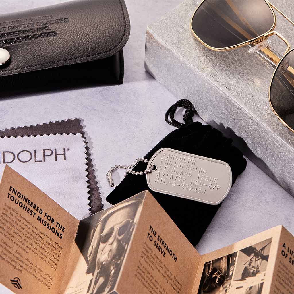 The authentic Randolph Military Aviator—worn by U.S. Military Pilots for over 40 years. Each pair in this special collection comes with embossed military-issued case, custom Randolph dog tag keychain and military-inspired cleaning cloth. Choose from Matte Chrome, 23k Gold or our NEW Matte Black finishes paired with SkyTec™ glass American gray lenses in both polarized and non-polarized options.