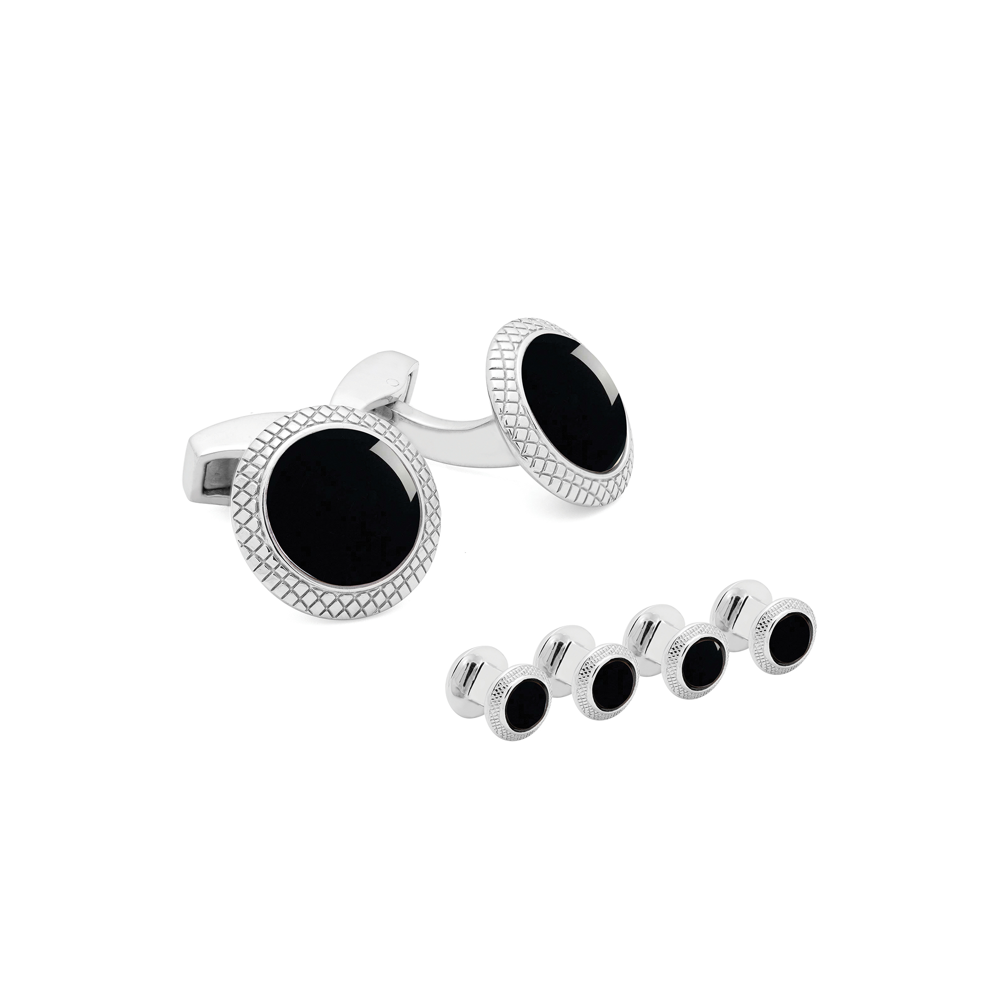 Exuding timeless elegance and meticulous craftsmanship, this Tateossian cufflinks and shirt studs set is the epitome of refined sophistication. Each piece features a polished black onyx centerpiece, symbolizing strength and sophistication, framed by a rhodium-plated base metal setting with an intricate diamond-patterned border. The contrast between the deep, lustrous onyx and the finely textured metal creates a distinguished look, perfect for black-tie affairs and formal occasions. A statement of understated luxury, this set is an essential finishing touch for the modern gentleman’s wardrobe.