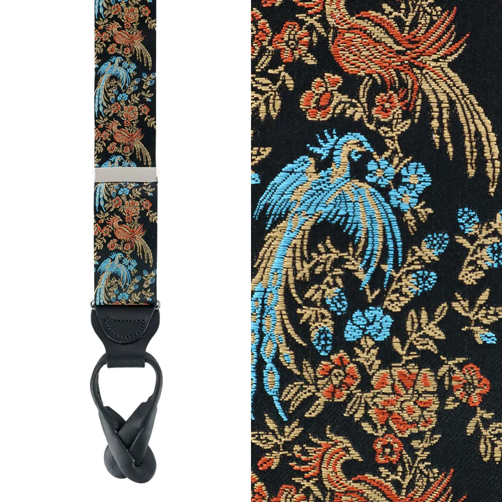 These braces are a beautifully handcrafted piece that will elevate your formal outfit. The Birds of Prosperity are said to bring good luck and are worn to wish good fortune. Imagine your groomsmen lined up at the altar wearing them and wishing you and your bride nothing but success and prosperity in your journey ahead. Or imagine presenting at an important meeting while wearing these distinguished suspenders, feeling confident, and crushing your presentation. They also make a memorable graduation gift to set the graduate up for success in their future career. Whatever the occasion, these silk braces will have you looking your best and set up for success!