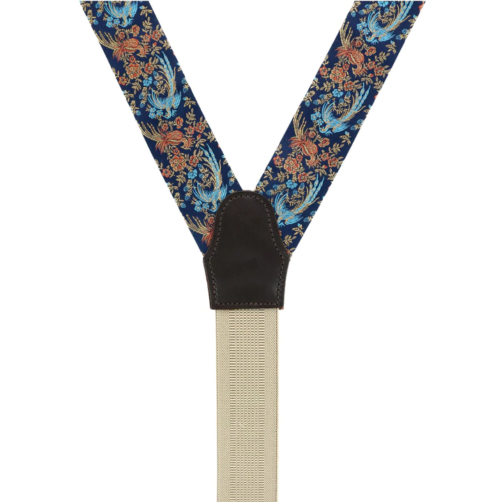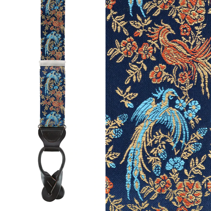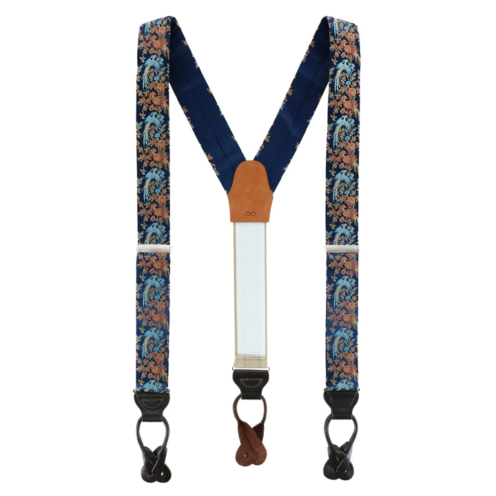 These braces are a beautifully handcrafted piece that will elevate your formal outfit. The Birds of Prosperity are said to bring good luck and are worn to wish good fortune. Imagine your groomsmen lined up at the altar wearing them and wishing you and your bride nothing but success and prosperity in your journey ahead. Or imagine presenting at an important meeting while wearing these distinguished suspenders, feeling confident, and crushing your presentation. They also make a memorable graduation gift to set the graduate up for success in their future career. Whatever the occasion, these silk braces will have you looking your best and set up for success!