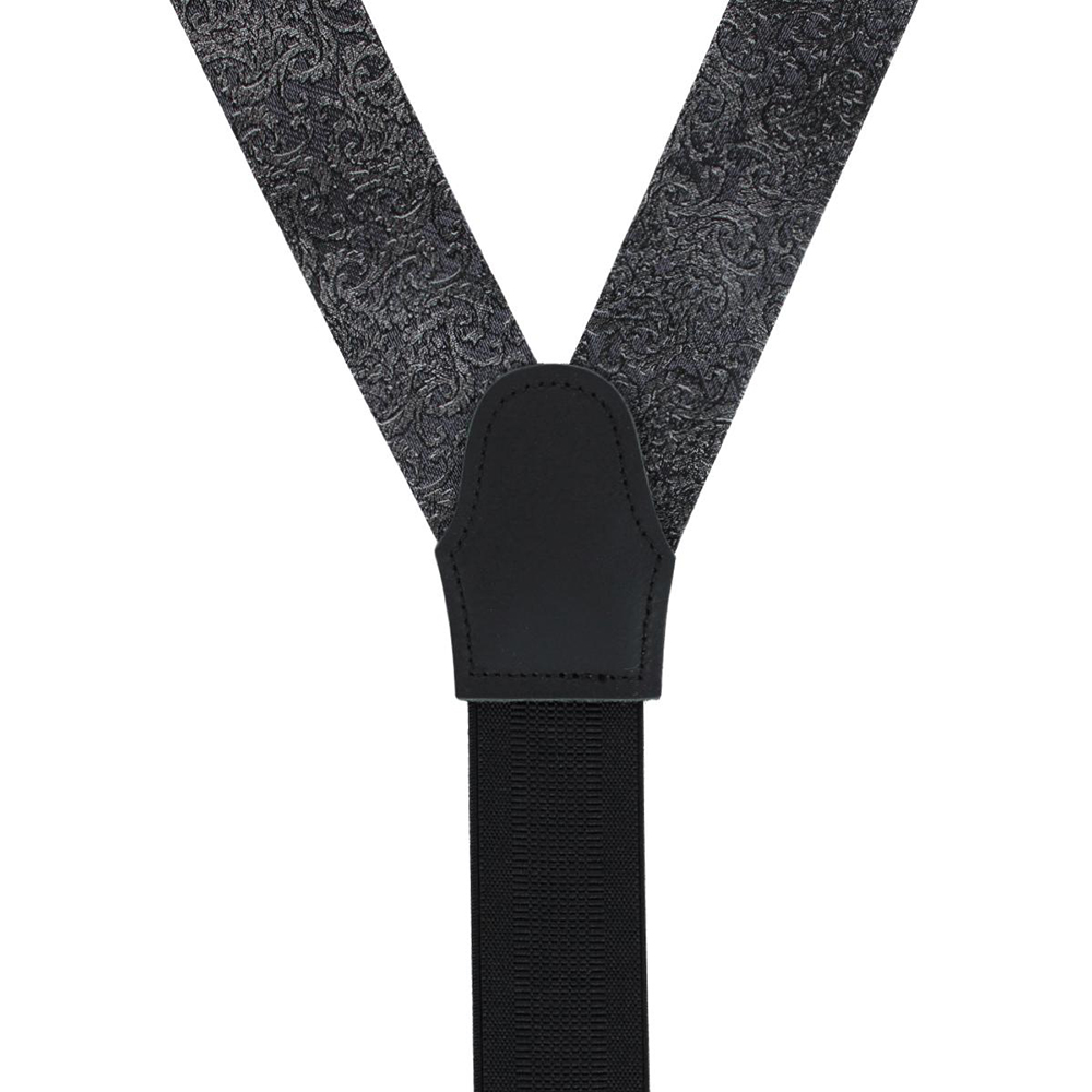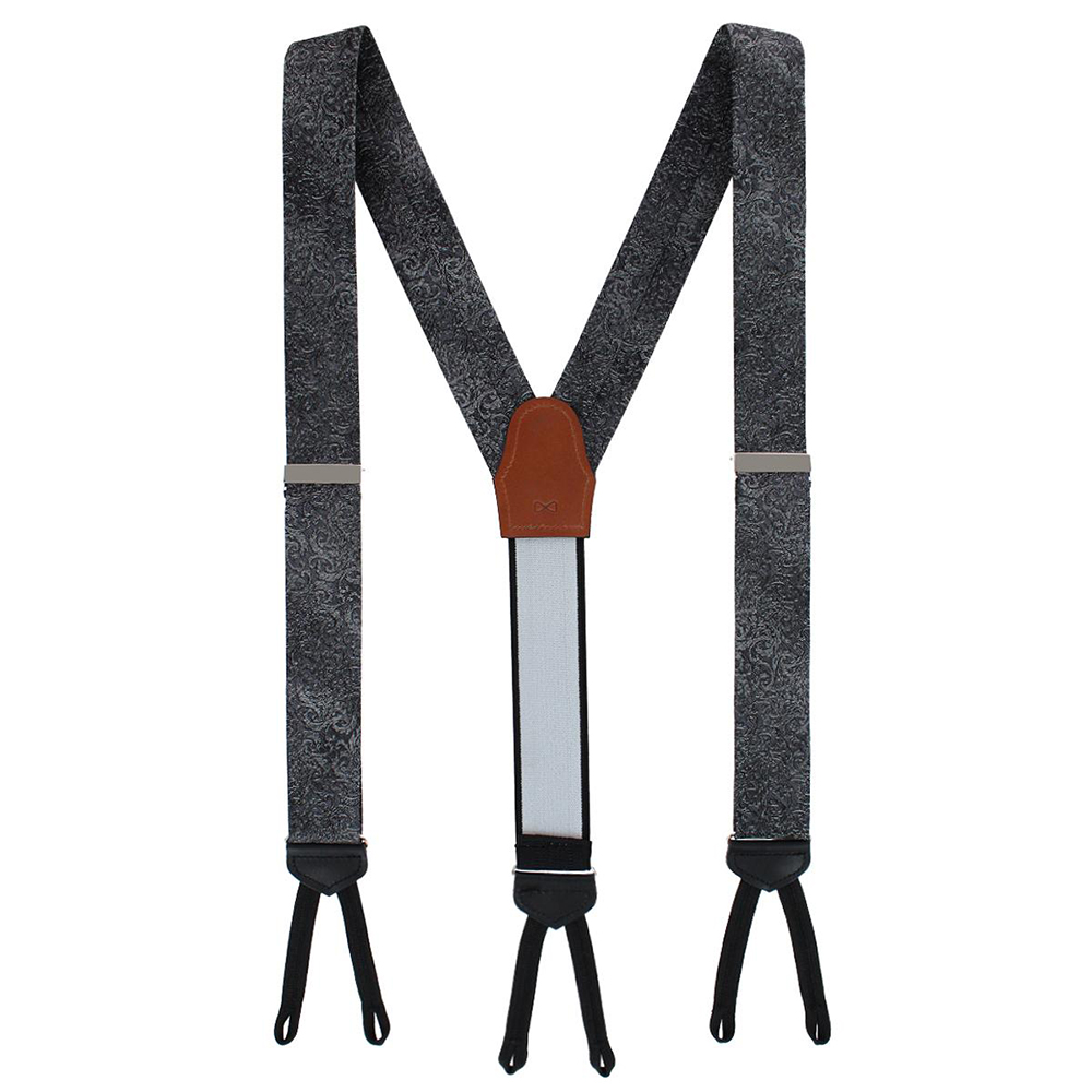 Elevate your wardrobe with the understated elegance of the Esteban Scrolling Vines Tone-on-Tone Patterned Silk Formal End Braces. Meticulously crafted from luxurious silk this suspender features an intricate scrolling vines motif woven into a subtle tone-on-tone design offering a refined texture and a polished finish. Ideal for formal occasions or adding a sophisticated touch to your professional attire this brace strikes the perfect balance between classic charm and modern flair. Its smooth silk fabric ensures a perfect dashing look every time while the timeless design complements any suit or shirt. Choose the Esteban brace to express your impeccable style with grace and confidence. Adjustable from 33 to 48 inches long. Be sure to check out the rest of the Esteban collection including the necktie pocket square bow tie and jewelry accessories. Made of 100% Silk and Genuine Leather. Features a handsome scrolling vine pattern in a tone-on-tone presentation. Measures 1 3/8 inches wide or 35mm. Perfect for holiday parties, weddings, boardroom meetings, or that special date night.