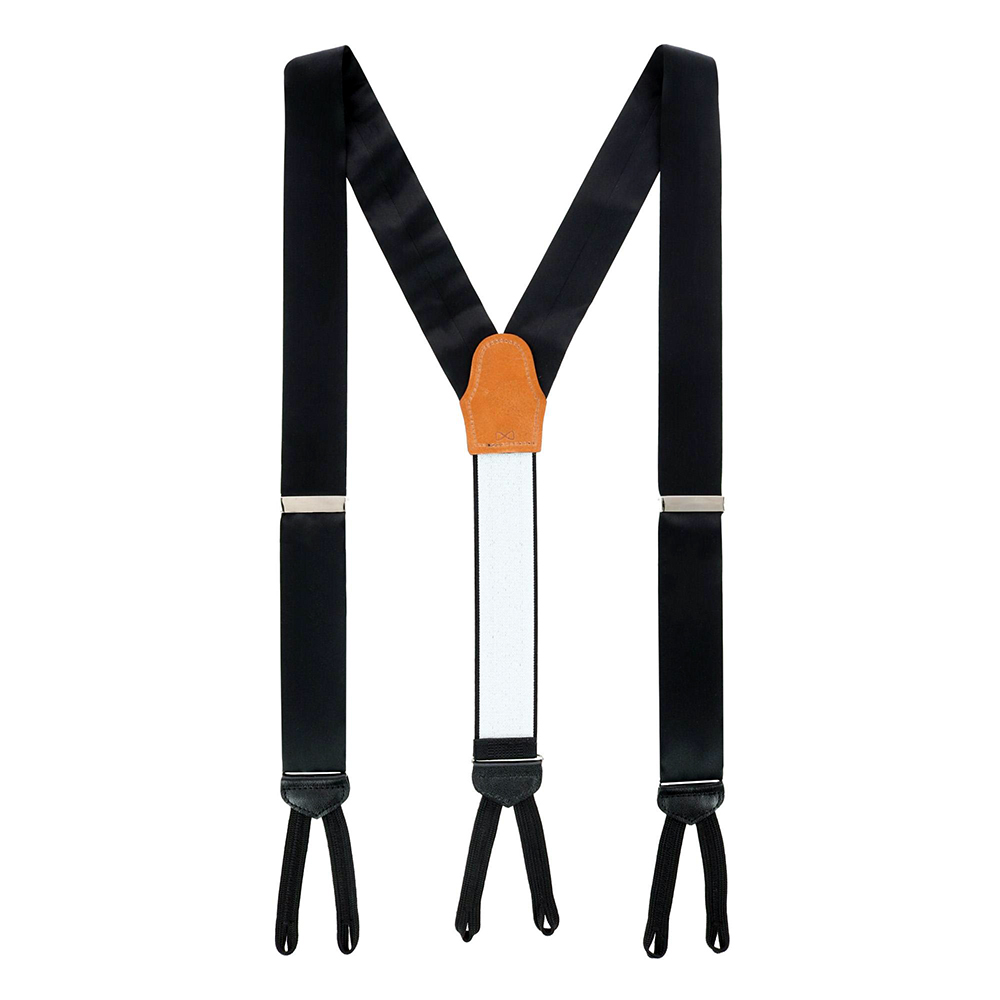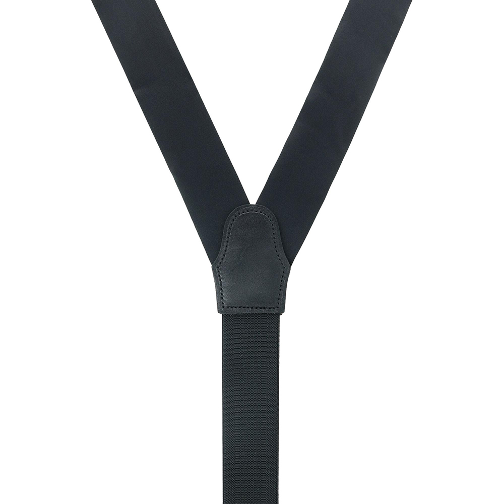 These big and tall pure silk formal end braces are the accessory you need to add a touch of class to your tuxedo or suit. Adjustable up to 55 inches the elastic back ensures these braces will be comfortable enough for you to wear all day. Feel like a million bucks while wearing these braces even with just a white shirt and a pair of classic dress pants. A pair of suspenders always adds an air of class style and sexiness to a man. This is the perfect accessory for weddings holiday parties business meetings and even date nights. Made of 100% Silk and Genuine Leather. Measures 1.5-inch or 38mm wide. Adjustable from 38 to 55 inches. Front and back leather drop tabs with nylon formal ends.