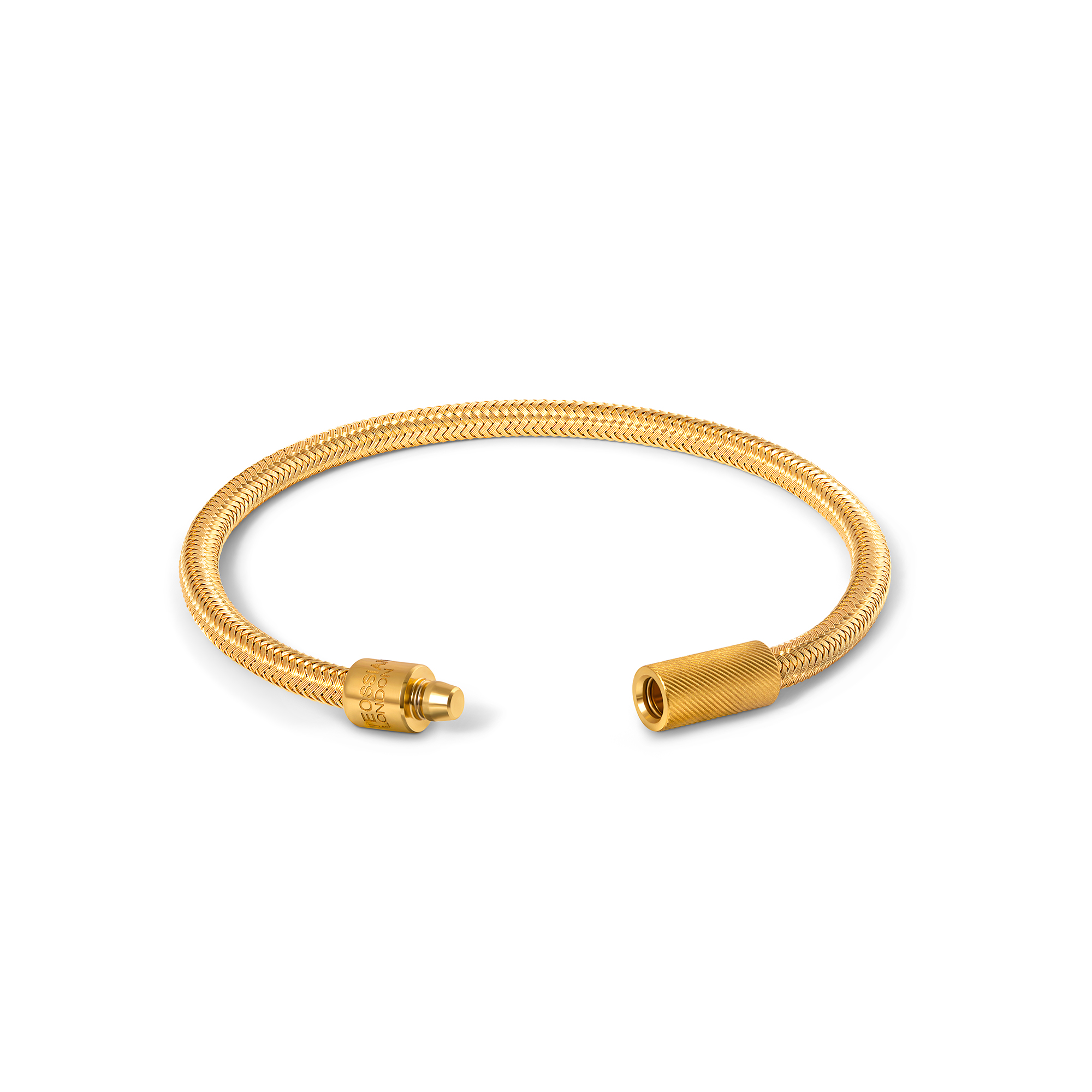 The bracelet is secured with a rhodium clasp, elevated with a 2-micron layer of 18K yellow gold plating, offering a striking contrast between industrial craftsmanship and refined opulence. Designed for those who appreciate artistry and innovation, this piece embodies the brand’s commitment to exceptional detailing and sophisticated design.