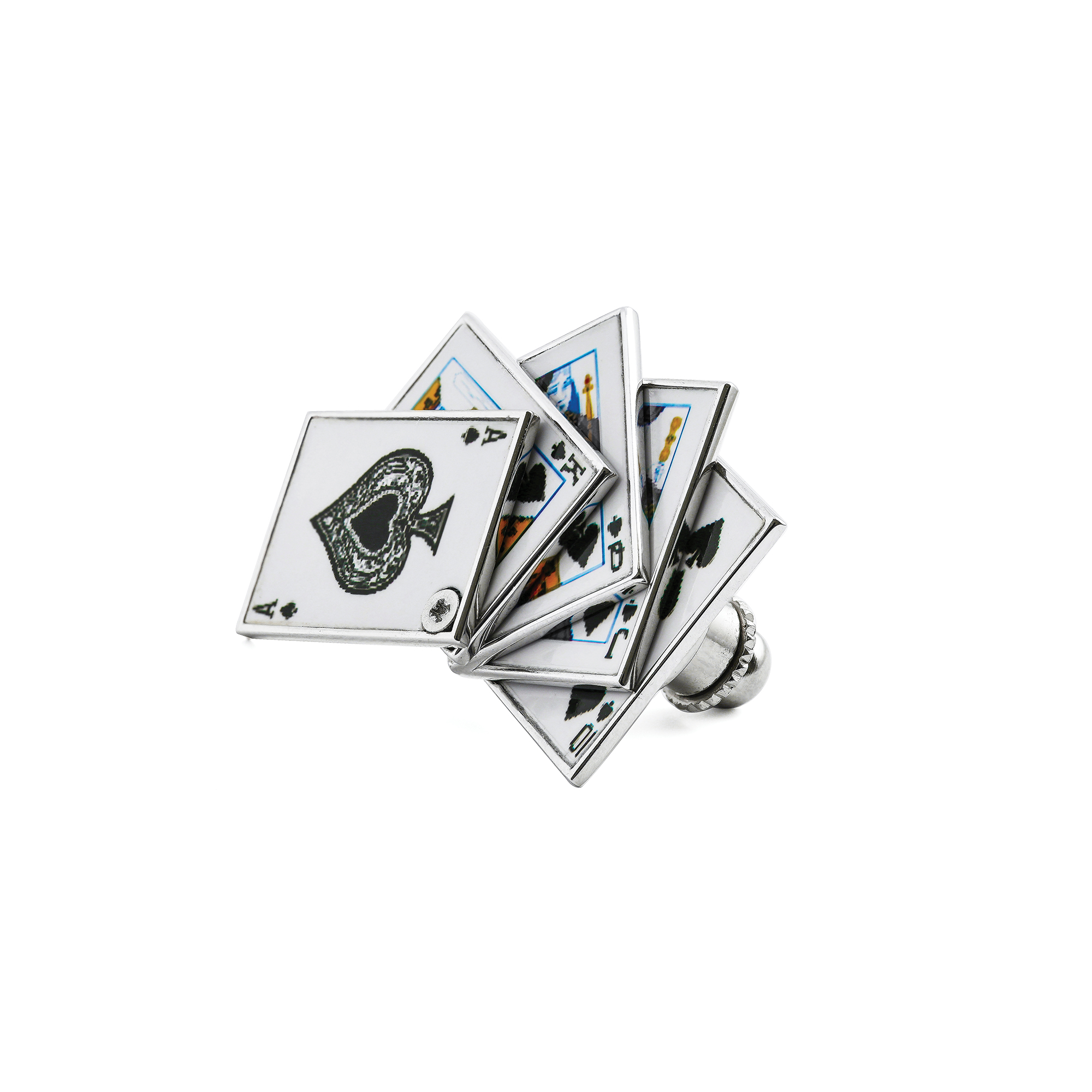 A masterfully designed lapel pin featuring a dynamic royal flush motif, where five playing cards elegantly fan out with a smooth, movable mechanism. Crafted from palladium-plated base metal, this statement piece exudes sophistication with a sleek, polished finish. Each card is meticulously printed with lifelike playing card imagery, capturing the thrill of the perfect hand. Designed by Tateossian, this unique accessory blends playful charm with refined craftsmanship, making it an exceptional detail for the modern gentleman’s wardrobe.