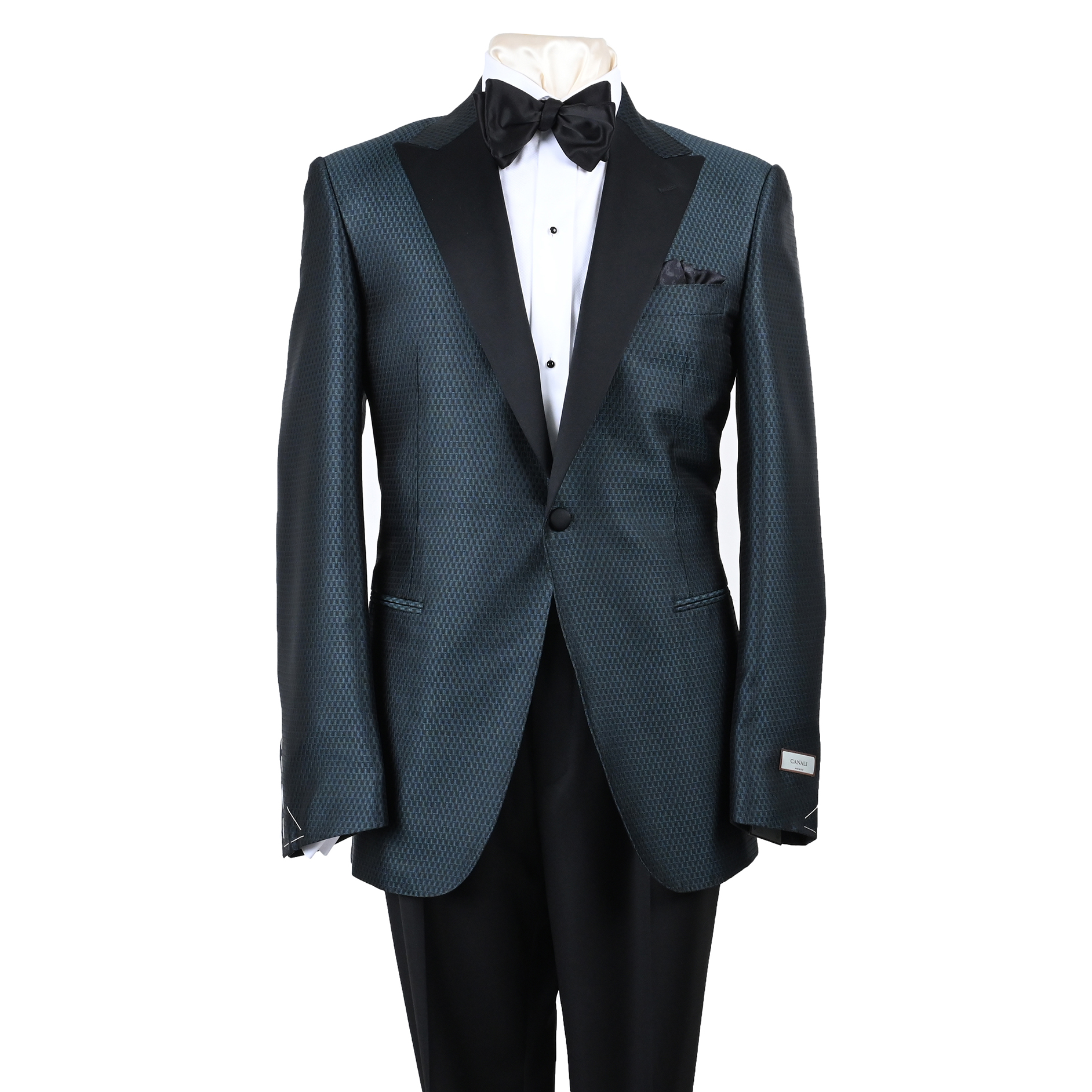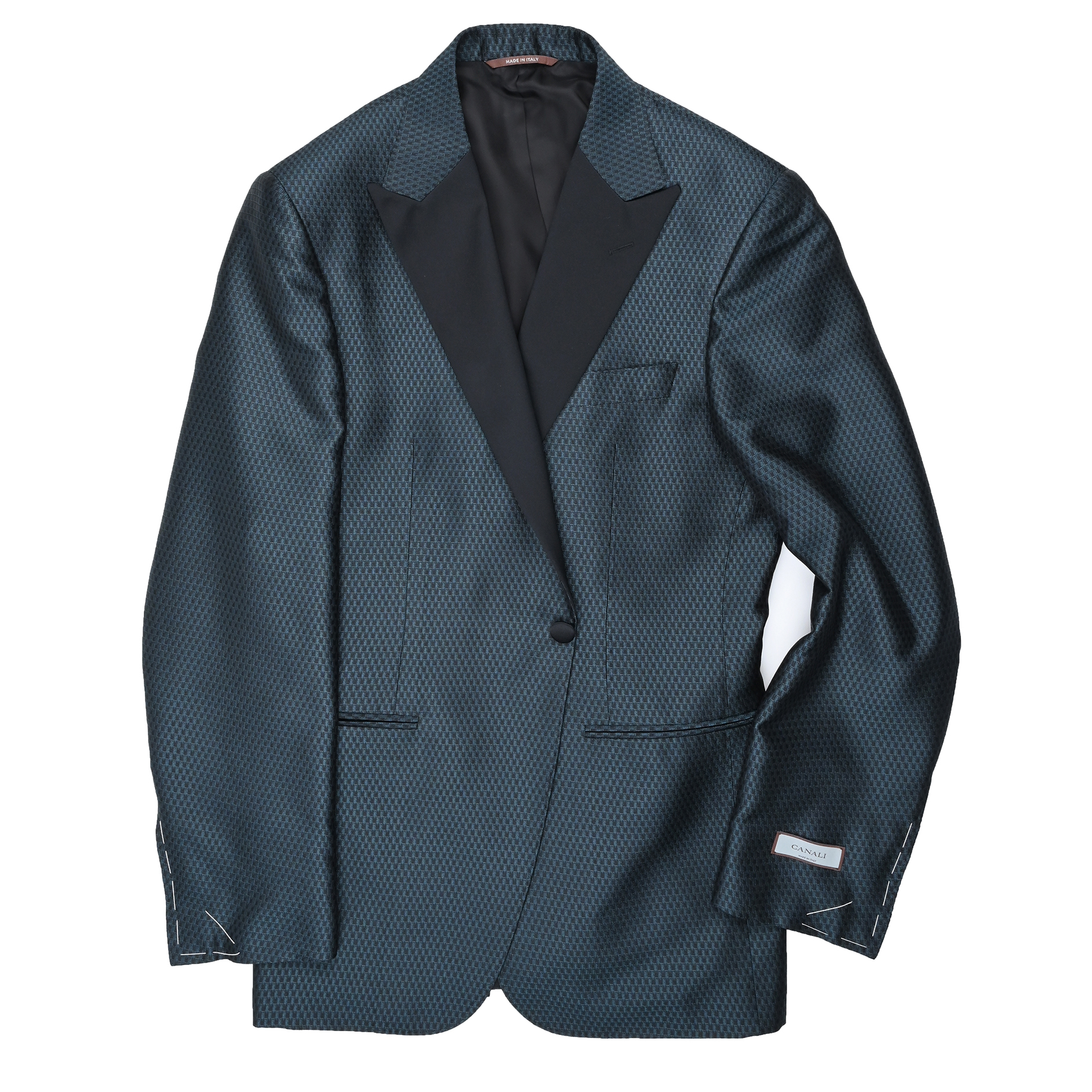 This Canali formal dinner jacket embodies bold sophistication with its navy and green jacquard pattern, crafted entirely from luxurious 100% silk. The intricate woven design offers depth and texture, creating a striking presence ideal for distinguished evening occasions. Fully lined with 100% cupro, it ensures a smooth, breathable fit for lasting comfort. Made in Italy, this jacket reflects Canali’s dedication to impeccable tailoring, refined style, and elevated elegance.
