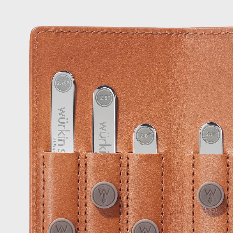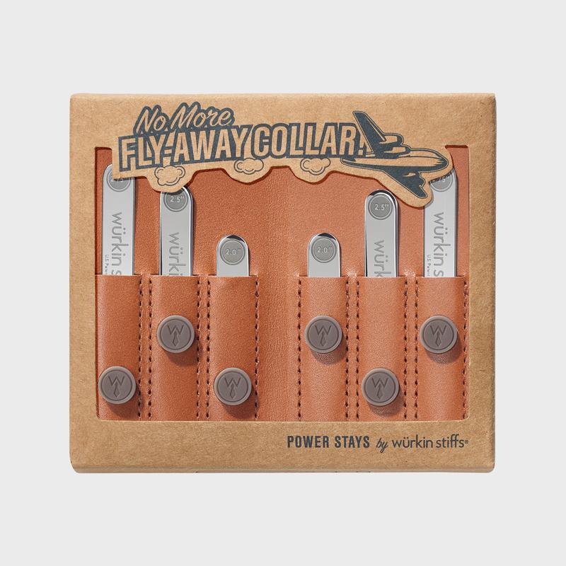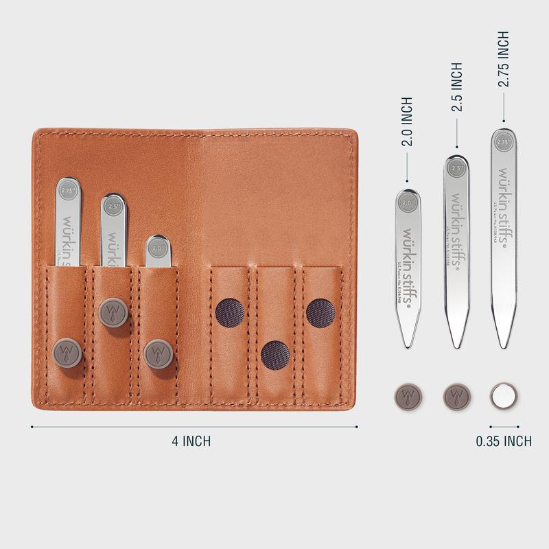 Six assorted size stays and six magnets kept tidy in a genuine leather case. Magnetically closes to the size of a business card, making it easy for the guy on the go.
