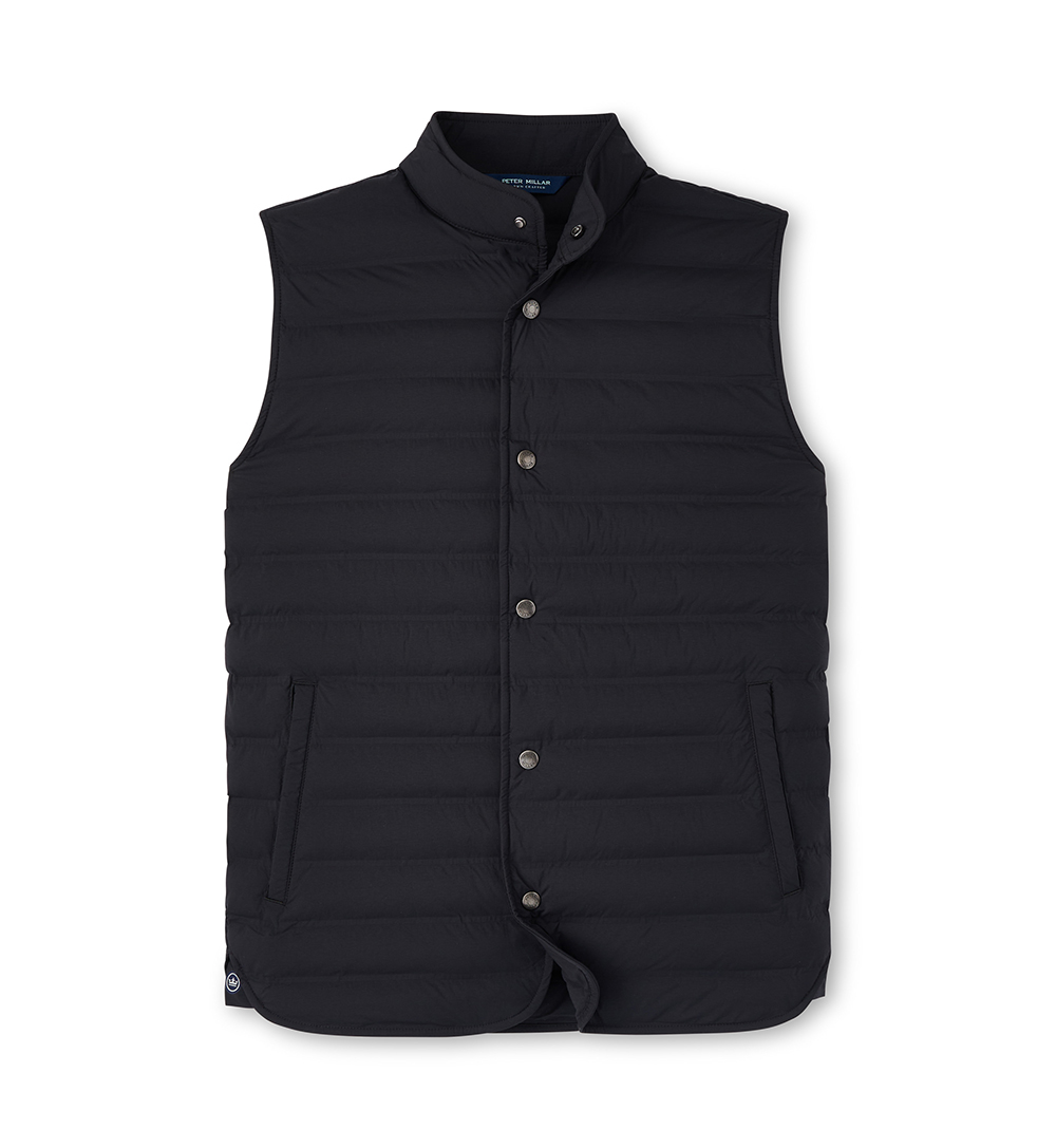 This Peter Millar Crown Crafted Regent Vest delivers high-performance functionality with refined style. Designed in a sleek black finish, it features a durable shell made from a flexible blend of nylon and spandex, offering exceptional 4-way stretch for unrestricted movement. The lightweight polyester fill provides reliable warmth, while the construction ensures windproof protection and water resistance for versatile all-weather wear. Blending technical innovation with a polished aesthetic, this vest embodies Peter Millar’s dedication to comfort, performance, and modern sophistication.