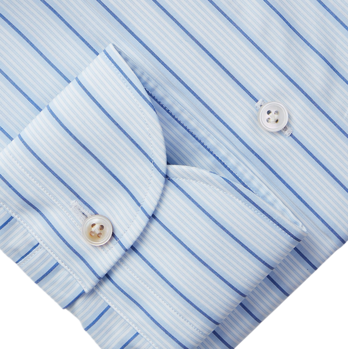 The classic blue stripe pattern lends a timeless appeal, while the precisely tailored silhouette ensures a polished and flattering fit. Designed with long sleeves and a structured collar, this shirt transitions seamlessly from formal business attire to distinguished evening wear.
