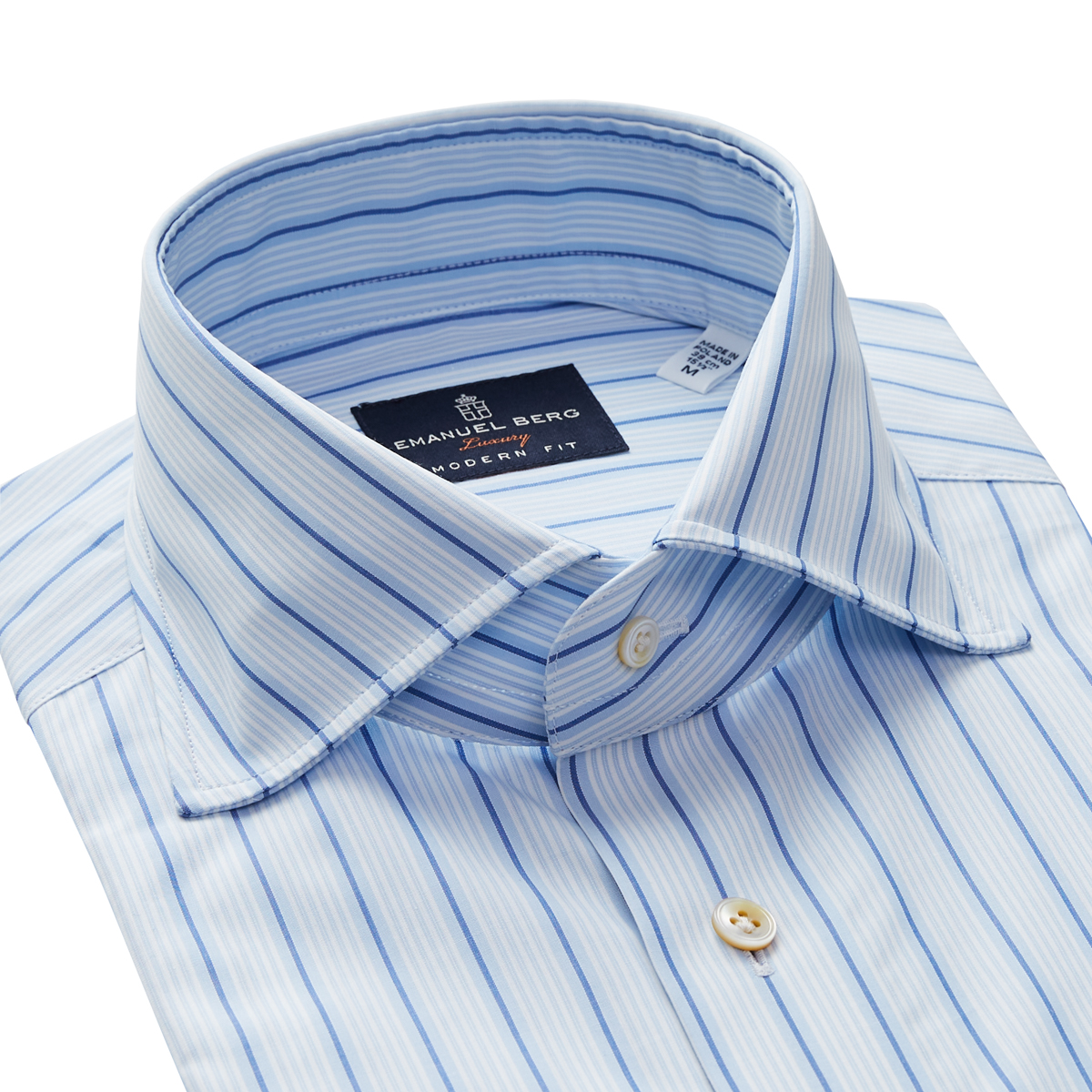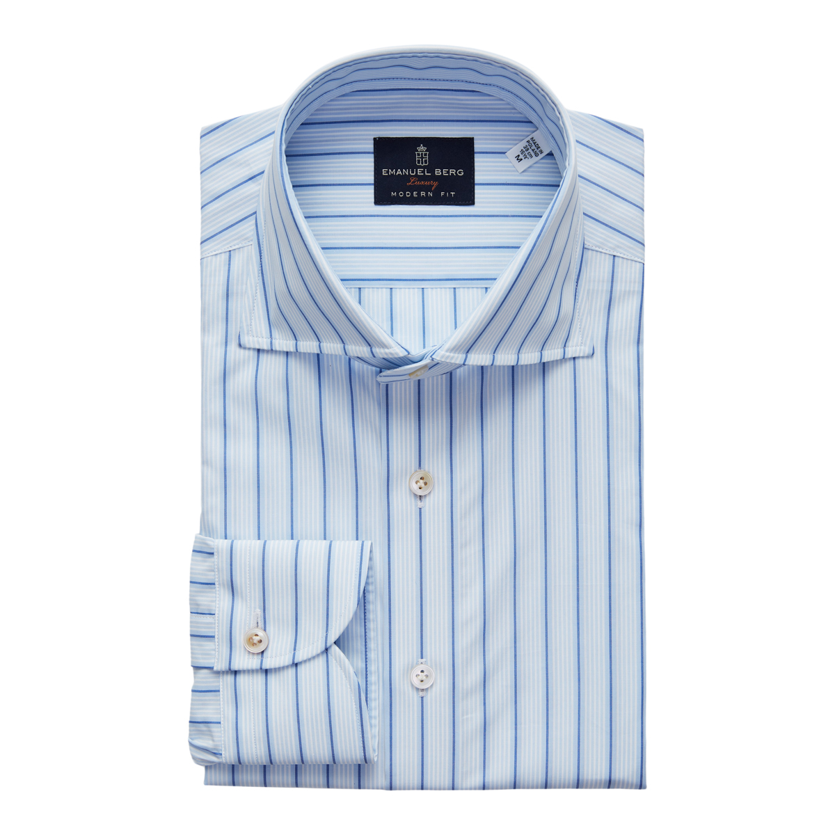 A wardrobe essential that pairs effortlessly with tailored suits or dress trousers, this Emanuel Berg striped dress shirt is a symbol of understated luxury and timeless style.