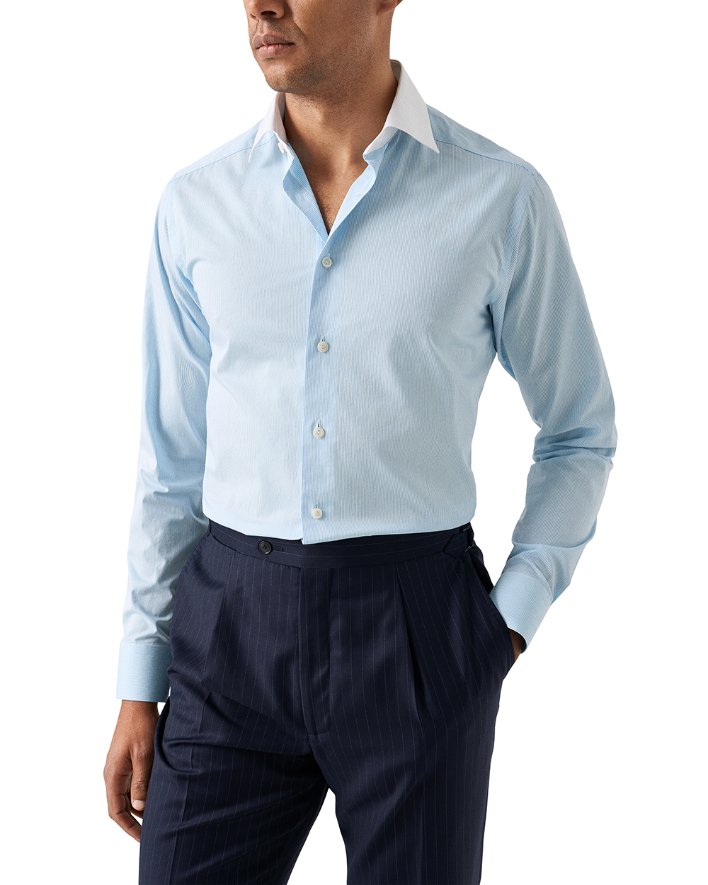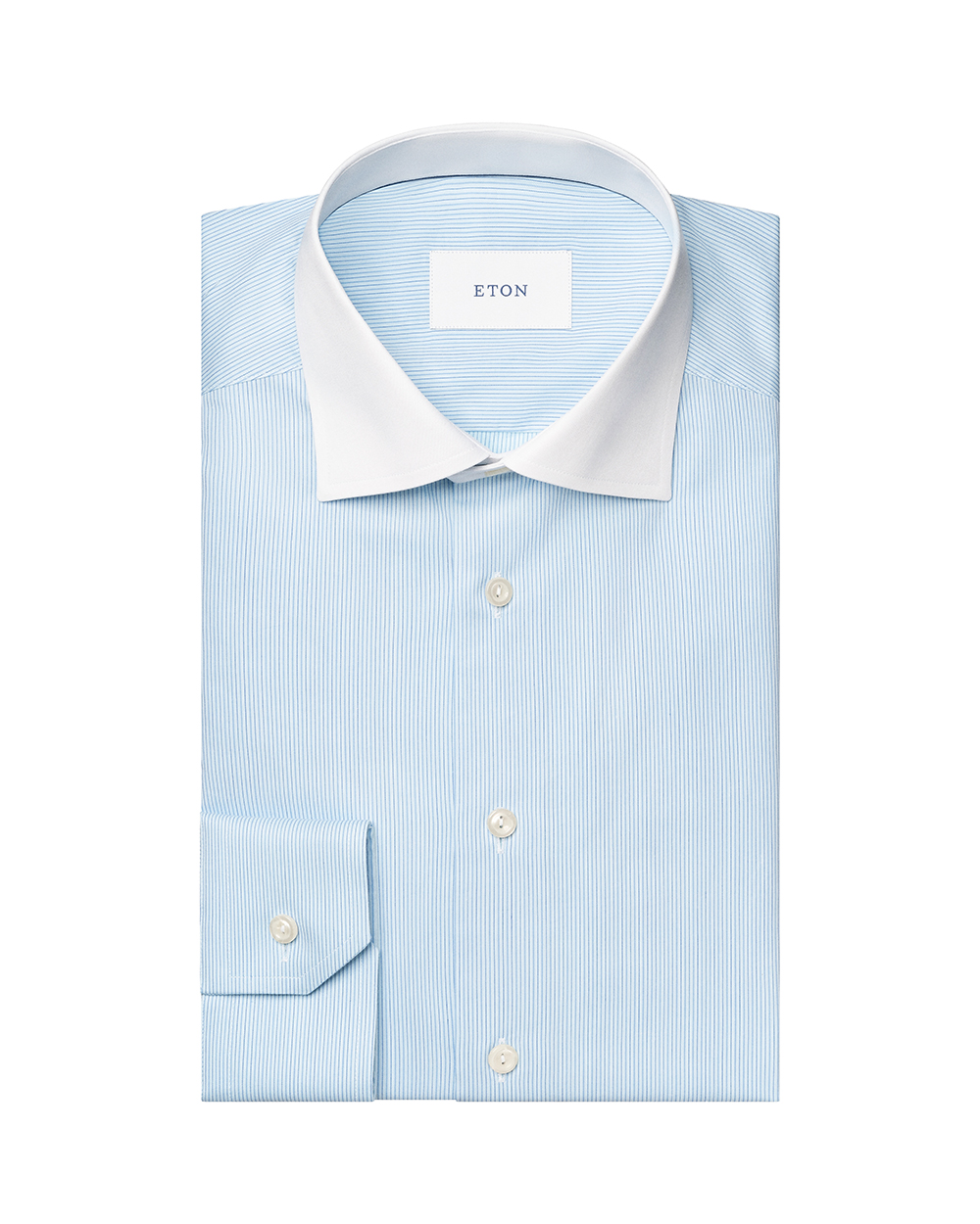 This Eton contemporary dress shirt delivers refined style with a distinctive, modern touch. Cut in the Contemporary fit, it offers a clean silhouette with comfortable ease. The cut away spread collar provides a sharp, versatile frame, enhanced by a contrasting white collar that adds a classic, elevated detail. Designed with single cuffs for a crisp finish, the shirt is crafted from fine twill in 100% cotton, offering a smooth hand, subtle texture, and excellent breathability. The light blue striped pattern brings timeless sophistication, making this shirt an ideal choice for both professional and polished everyday wear.