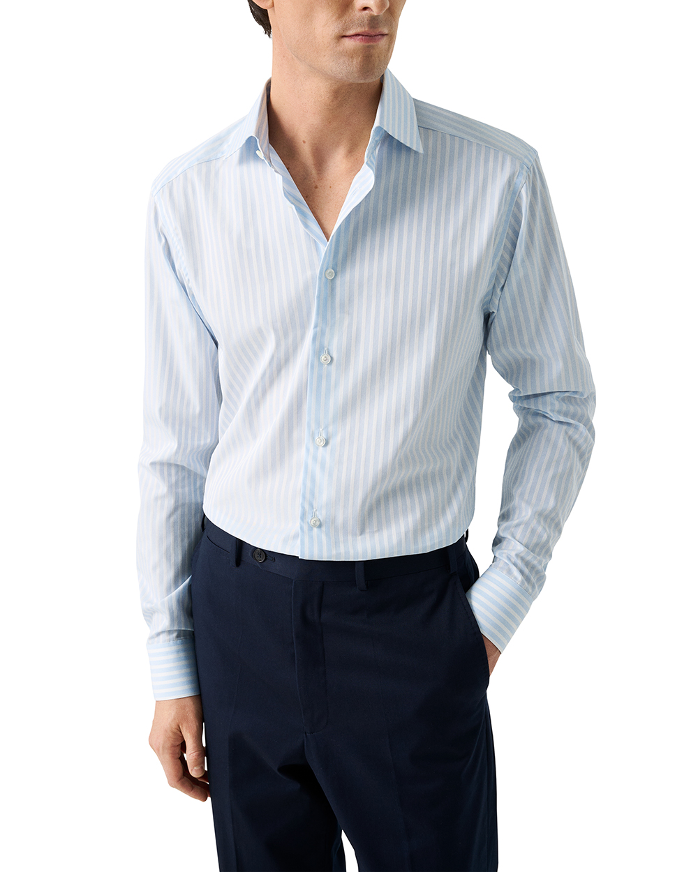 This Eton contemporary dress shirt blends classic patterning with modern refinement. Cut in the Contemporary fit, it offers a clean silhouette with comfortable ease. The cut away spread collar provides a sharp, versatile frame, while the single cuff keeps the look crisp and understated. Crafted from Elevated Pique in 100% cotton, the fabric adds subtle depth and a refined hand feel. The light blue Bengal stripe pattern delivers timeless sophistication, making this shirt an ideal choice for both business and polished everyday wear.
