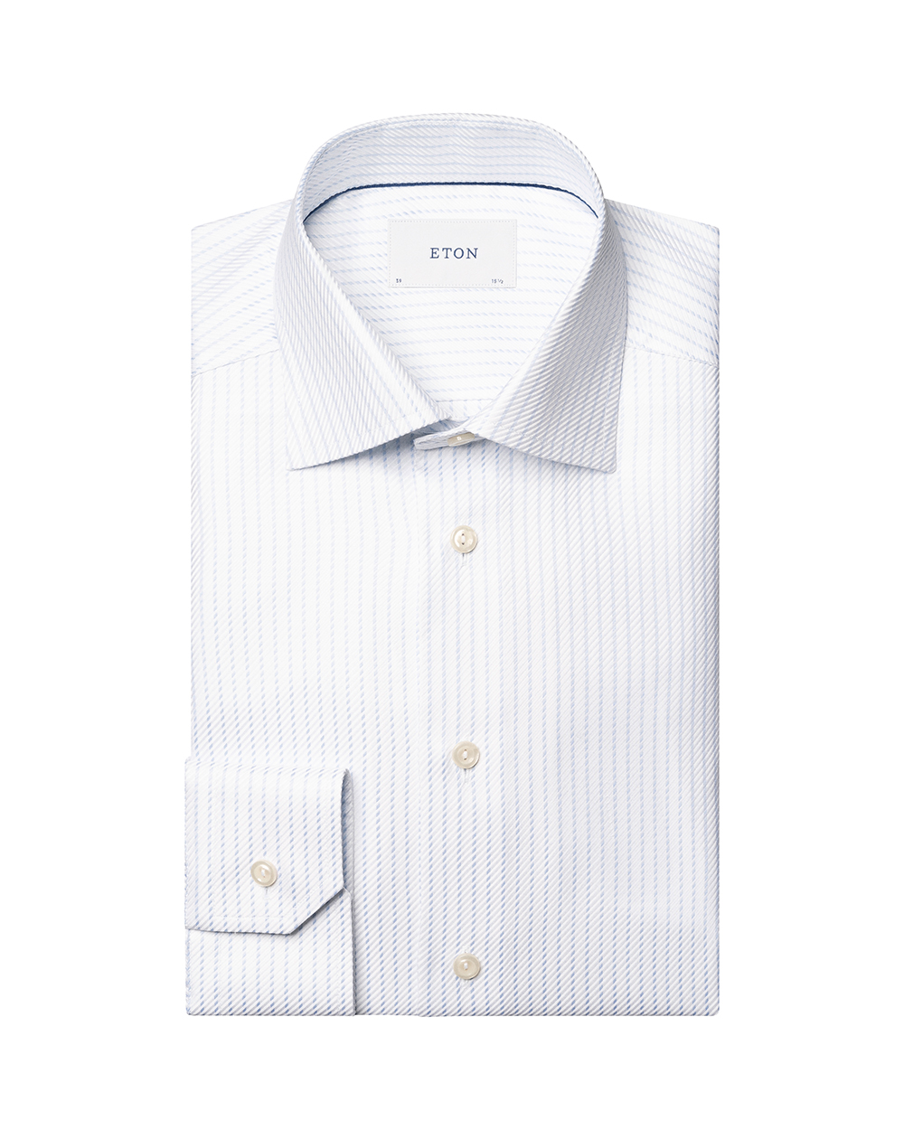 A sophisticated update to a timeless pattern, this Eton contemporary fit dress shirt delivers a clean silhouette with versatile elegance. The cut away spread collar frames the neckline with modern refinement, while the single convertible cuffs allow for both button or cufflink styling. Crafted from Eton’s luxurious textured twill, the white and blue stripe design offers subtle depth, crisp structure, and enduring comfort. A polished choice that transitions seamlessly from business attire to refined evening wear, embodying Eton’s hallmark craftsmanship.