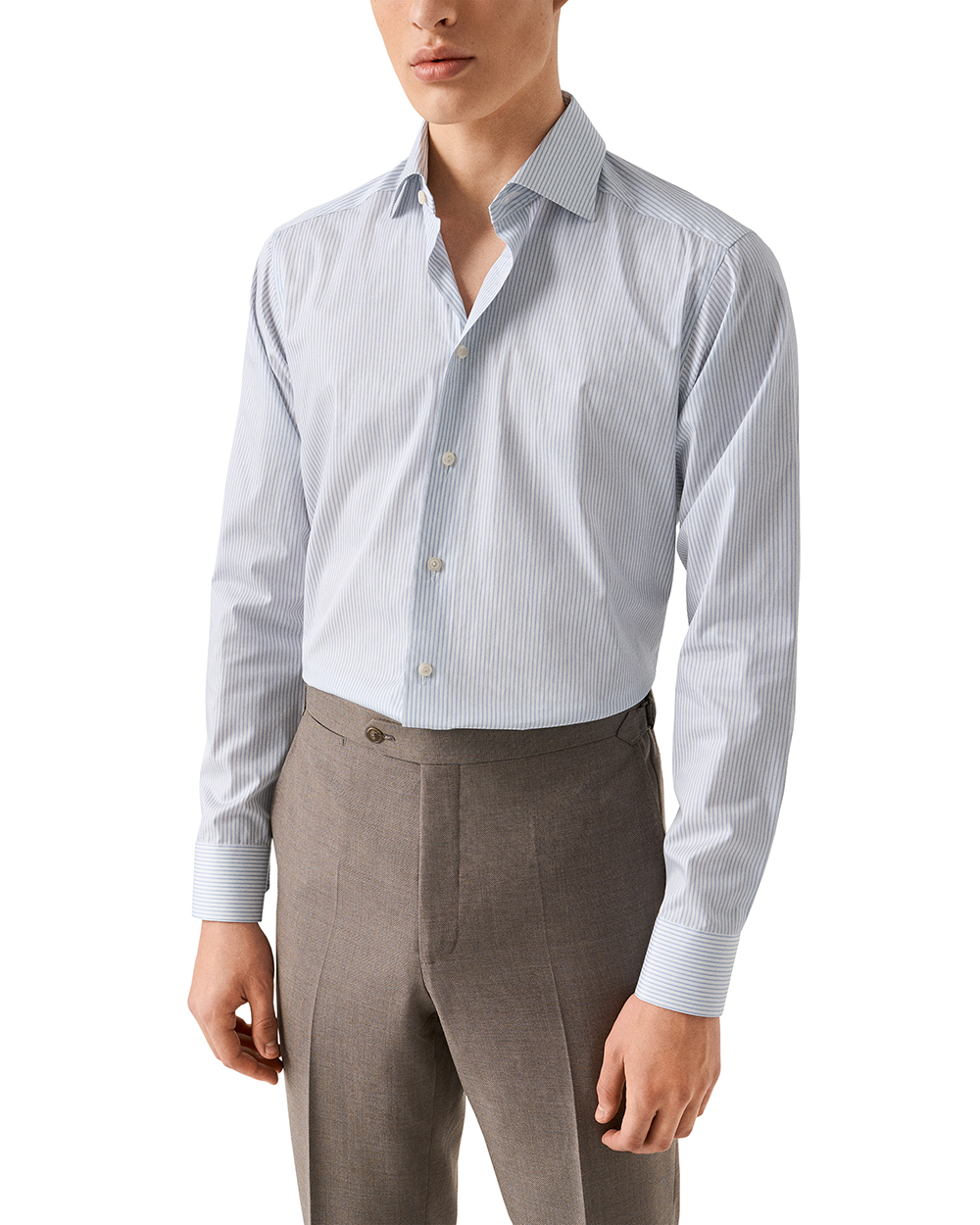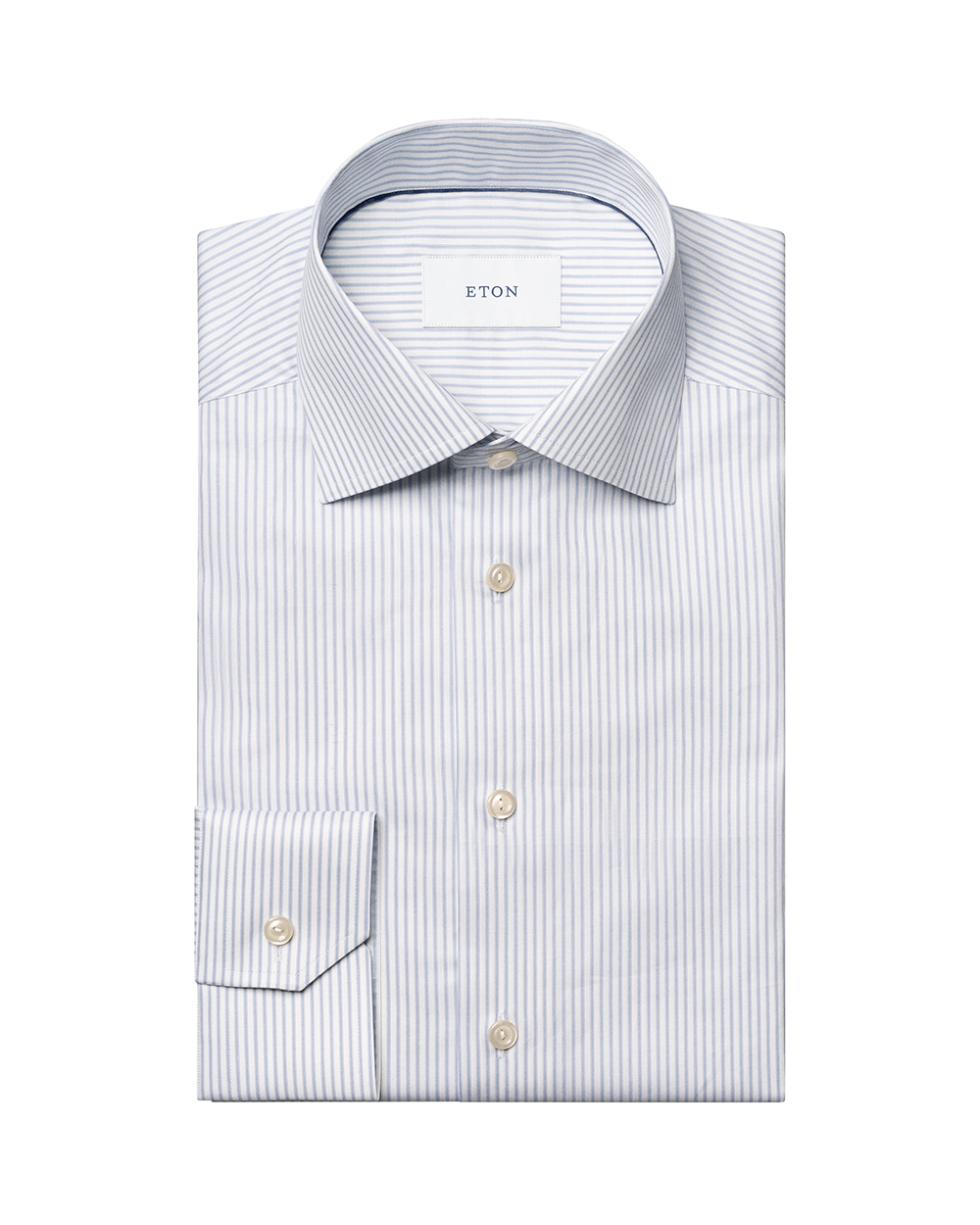 This Eton slim dress shirt combines sharp modern tailoring with classic pattern and refined texture. Cut in the Slim fit, it offers a streamlined, contemporary silhouette. The cut away spread collar adds versatility for both open-collar wear and wider tie knots, while the single cuff keeps the finish clean and understated. Crafted from Eton’s fine twill fabric in 100% cotton, it delivers a smooth feel, subtle sheen, and excellent breathability. The white and blue striped pattern adds timeless sophistication, making this shirt a polished choice for both professional and elevated everyday style.