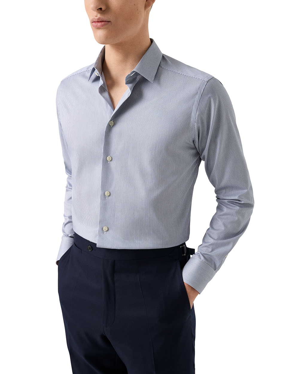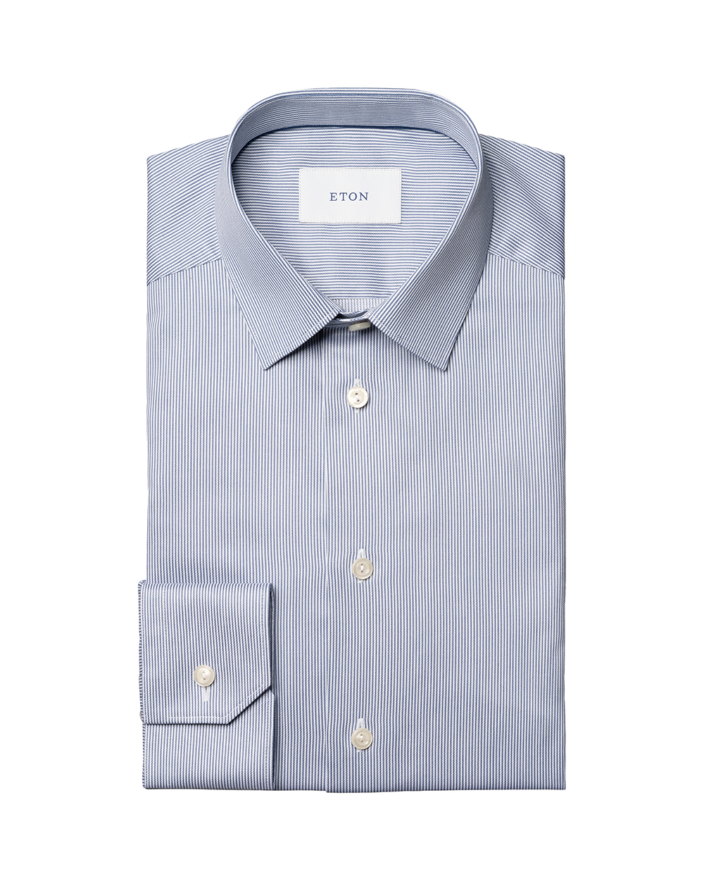 This Eton slim dress shirt combines sharp modern tailoring with refined, understated style. Cut in the Slim fit, it offers a clean, streamlined silhouette. The pointed collar brings a classic, versatile touch, while the single cuff maintains a crisp, minimalist finish. Crafted from Eton’s renowned Signature Twill in 100% premium cotton, it provides exceptional softness, breathability, and a subtle sheen. The mid–blue fine stripe pattern adds depth and sophistication, making this shirt an ideal choice for both professional and elevated everyday wear.