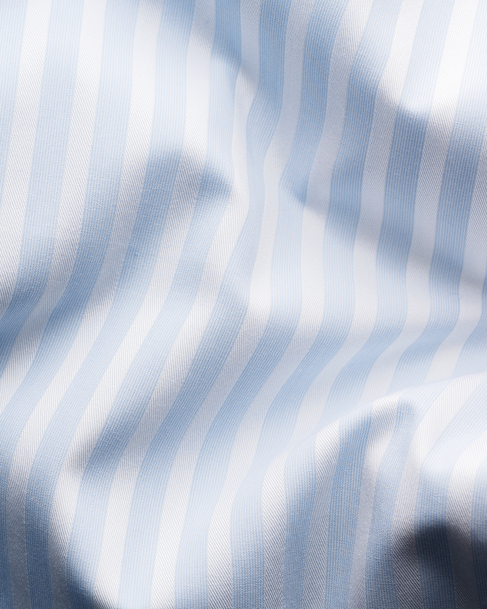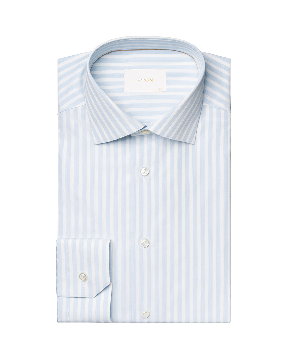 This Eton slim dress shirt combines a sharp modern fit with classic pattern and refined texture. Tailored in the Slim fit, it offers a clean, streamlined silhouette enhanced by a cut away spread collar that works equally well with or without a tie. The single cuff keeps the look crisp and understated. Crafted from Elevated Pique in 100% cotton, it features a light blue and white Bengal stripe pattern that adds timeless sophistication and subtle depth. Comfortable, elegant, and impeccably made, this shirt reflects Eton’s commitment to quality and enduring style.