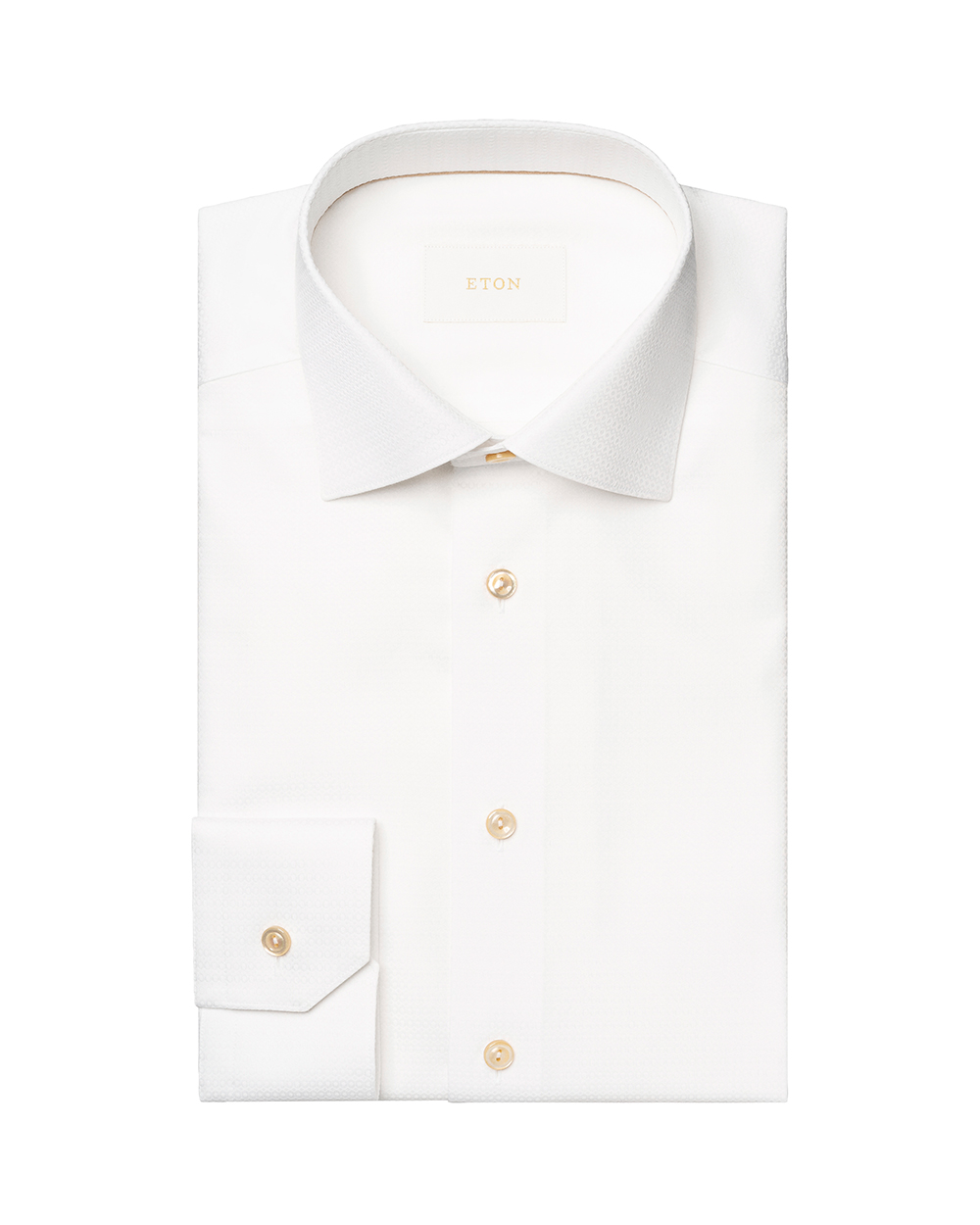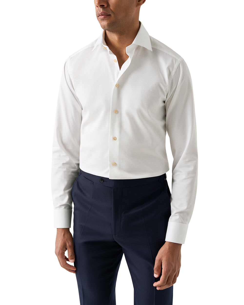 This Eton slim dress shirt offers a refined blend of modern tailoring and elevated texture. Designed in the Slim fit, it provides a clean, streamlined silhouette, while the cut away spread collar adds versatility for both open-collar and tie-worn looks. The single cuff maintains a crisp, understated finish. Crafted from Elevated Pique in 100% cotton, the fabric delivers subtle depth, softness, and a polished appearance. In classic white, this shirt stands as a timeless wardrobe essential that reflects Eton’s signature quality and craftsmanship.