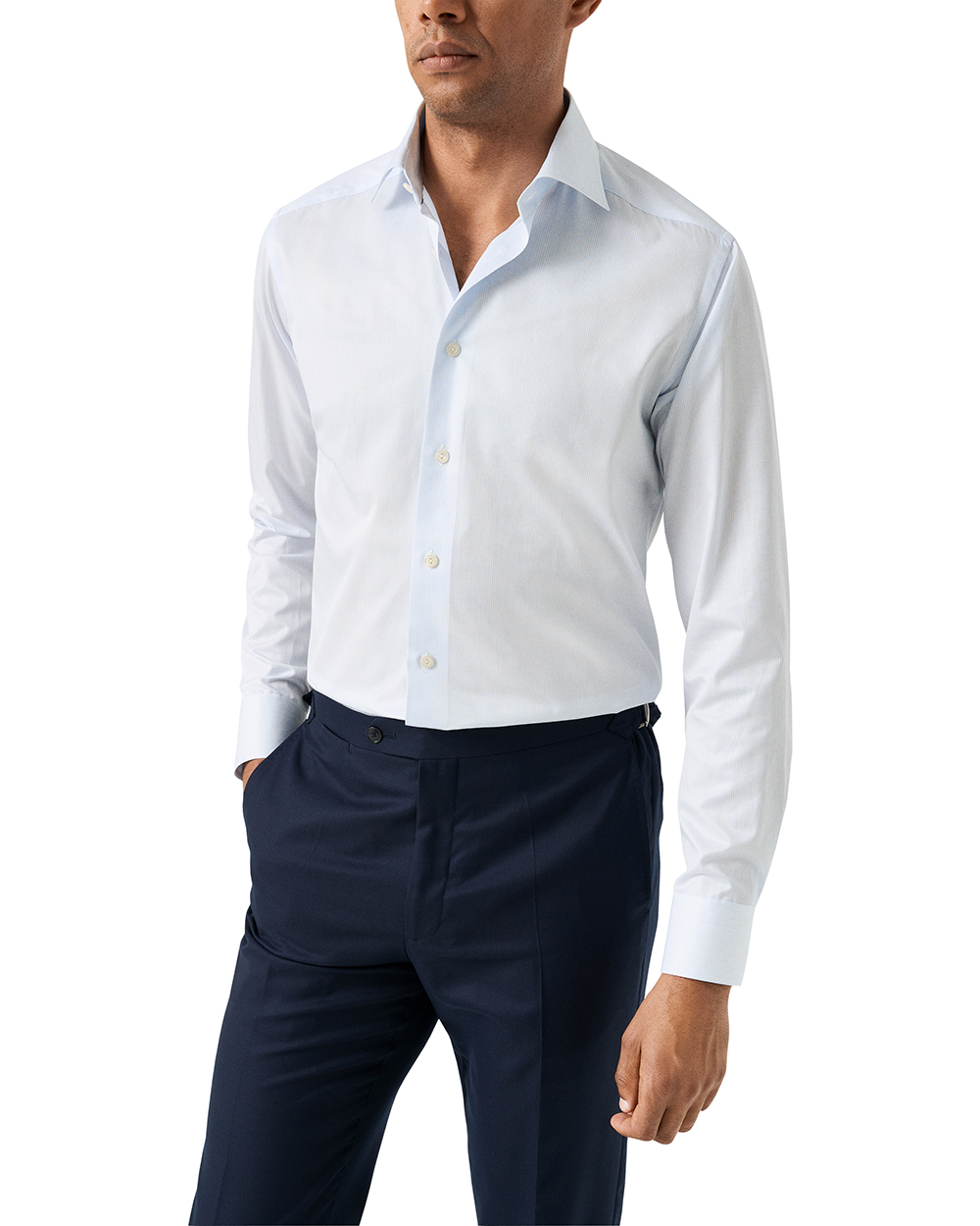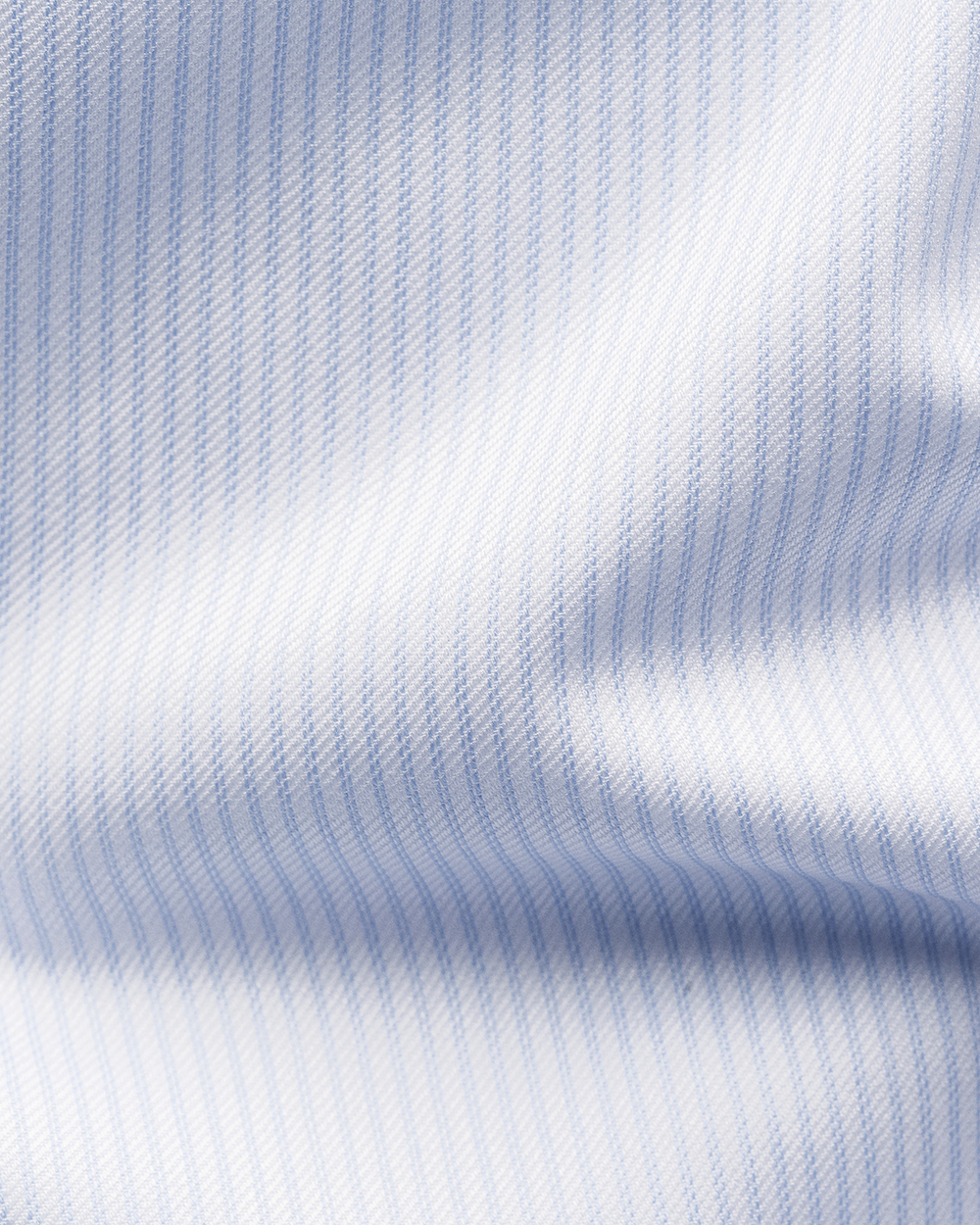 This Eton slim dress shirt combines modern tailoring with classic striped refinement. Cut in the Slim fit, it offers a sharp, streamlined silhouette ideal for a polished, contemporary look. The cut away spread collar adds versatility for both open-collar styling and wider tie knots, while the single cuff keeps the finish clean and understated. Crafted from Eton’s Signature Twill in 100% cotton, the fabric delivers exceptional softness, a subtle sheen, and a smooth, refined drape. The blue fine striped pattern adds timeless sophistication, making this shirt a versatile choice for both business and elevated everyday wear.