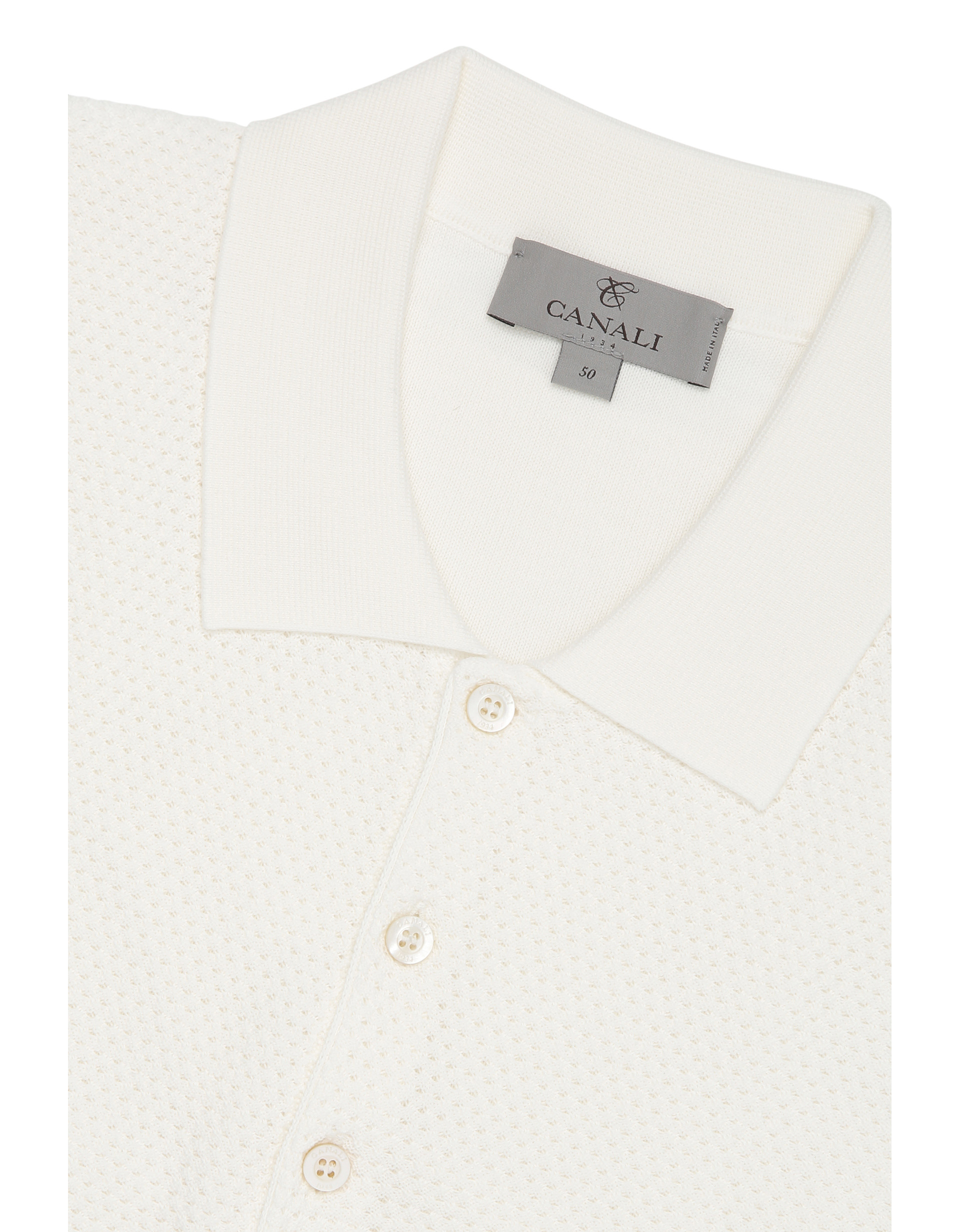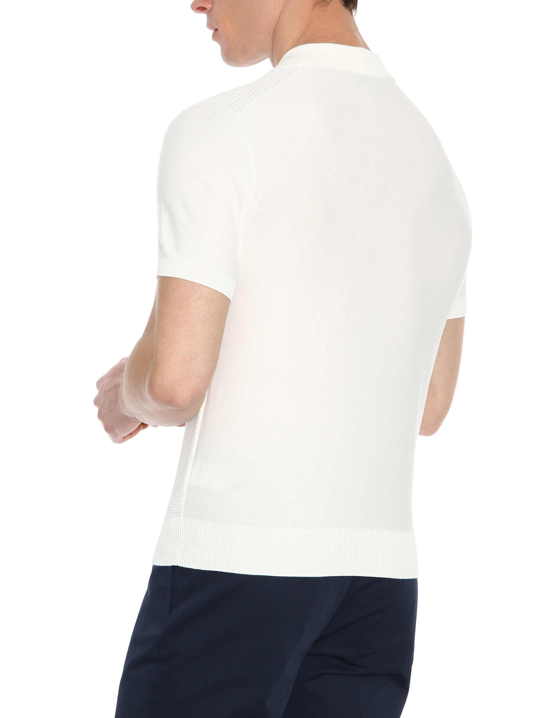 This classic white, 3 button knitted polo shirt in pure cotton features a textured torso with contrasting sleeves, adding dynamic movement and style to the traditional fit. Equipped with ribbed sleeves, hem and collar, this garment ensures comfortable wearability during the long summer days.