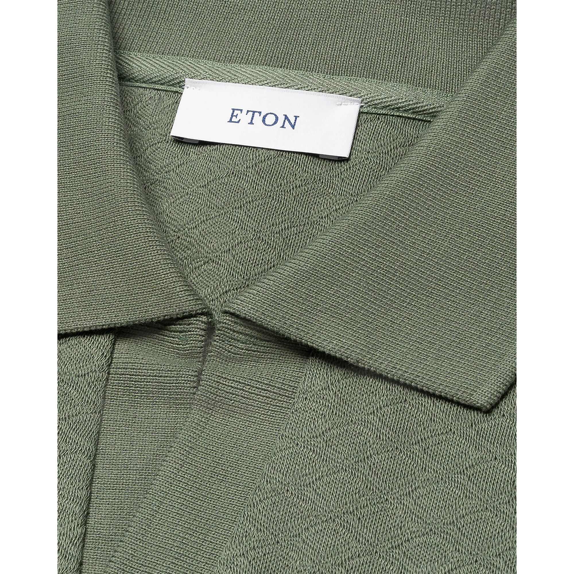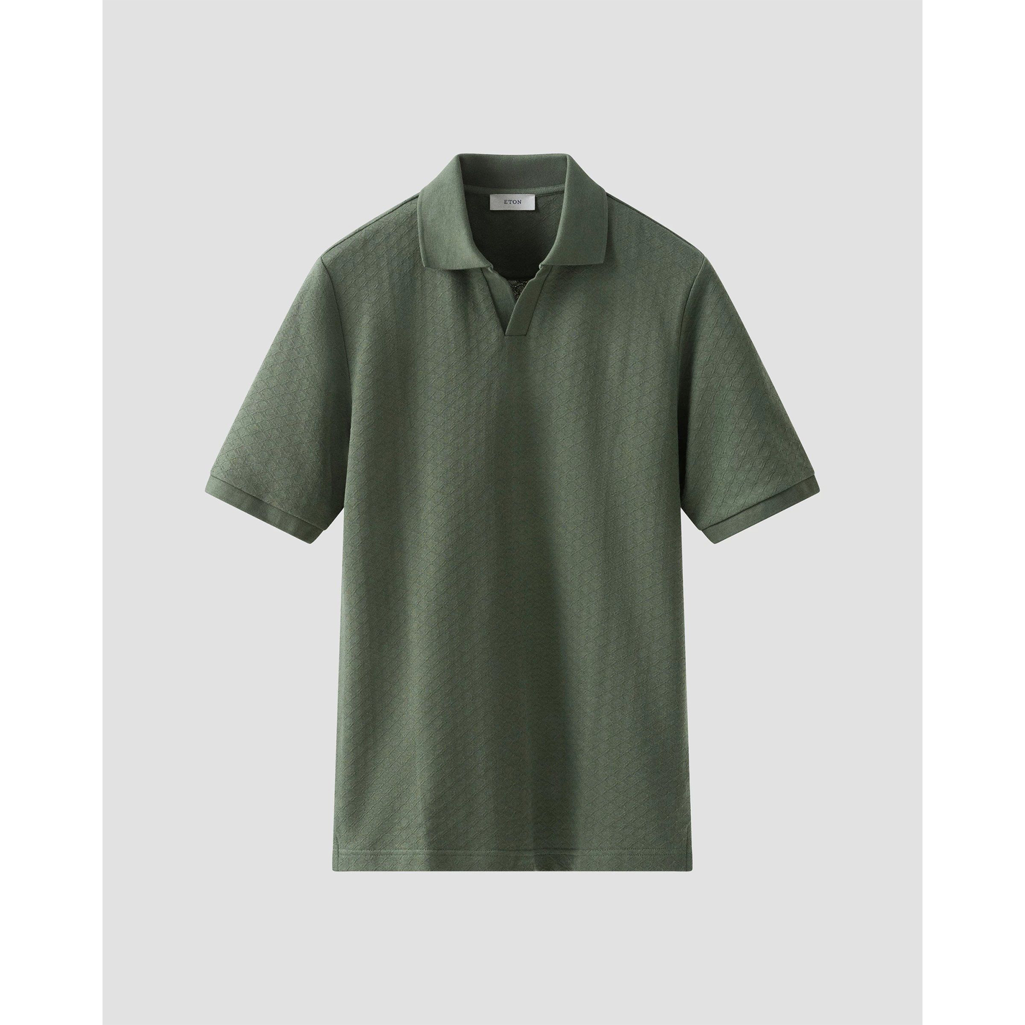 Refined yet effortlessly stylish, this dark green jacquard knit polo shirt from Eton redefines smart casualwear with luxury and sophistication. Crafted from a premium cotton, this polo delivers an ultra-soft touch, breathability, and a subtly structured drape that enhances its modern silhouette.
