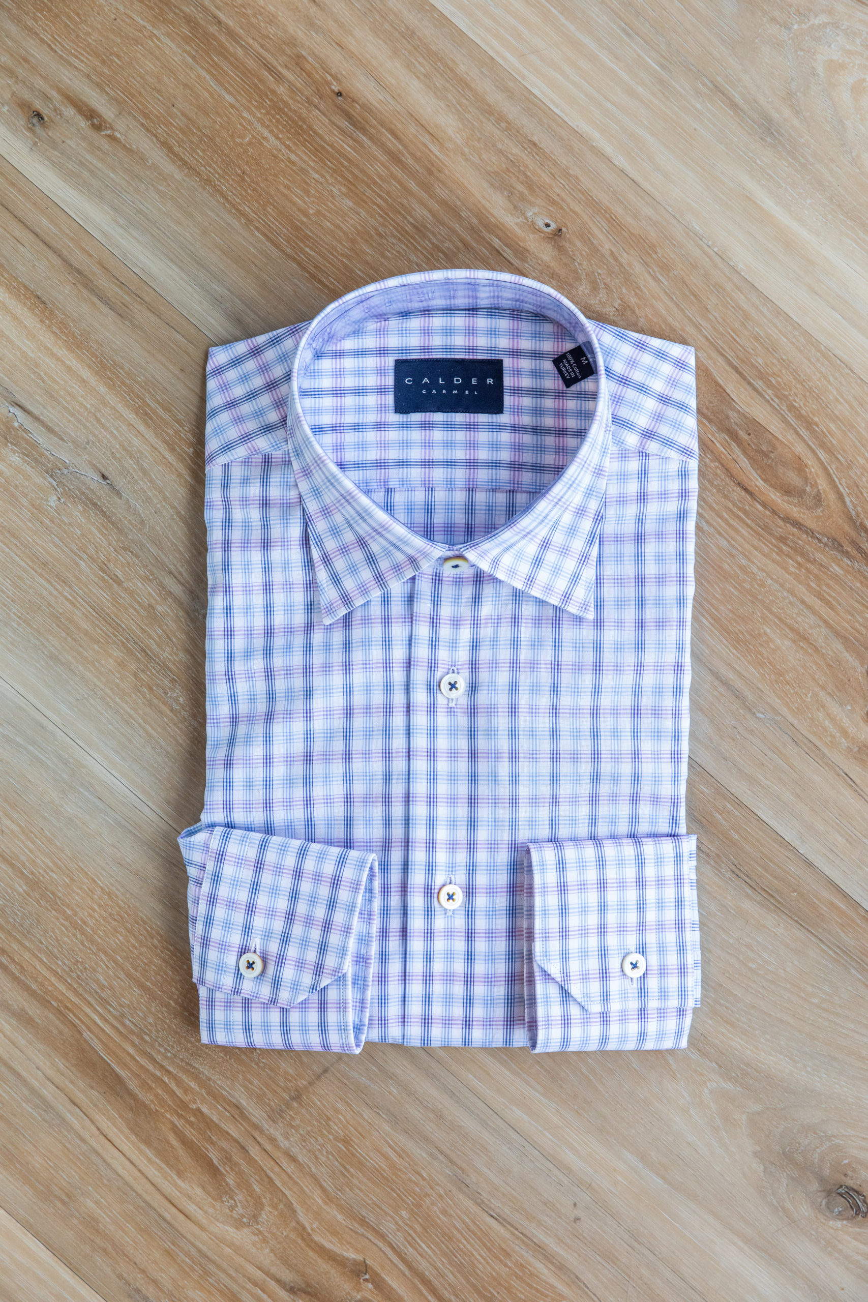 Calder Carmel Lux Melange Check in Navy with Lilac accent stripe and white background. Suitable to wear with sport coat, dress slacks, 5 pocket pants or jeans.