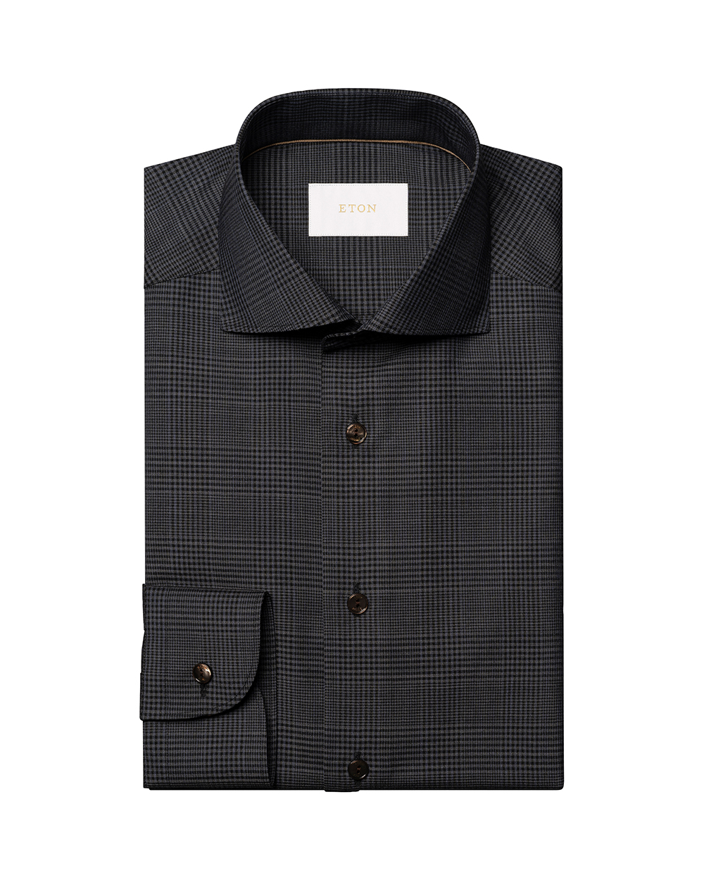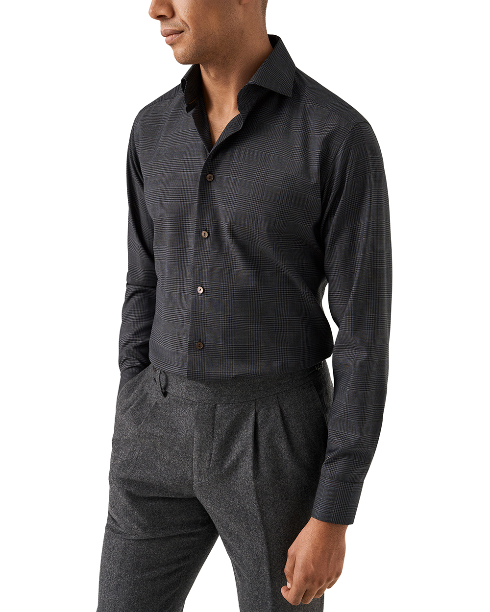 This Eton contemporary sport shirt offers a luxurious interpretation of a classic pattern. Tailored in a contemporary fit, it features a wide spread collar and rounded single cuffs for a refined, modern silhouette. Crafted from 100% wool, it provides a soft, lightweight feel with natural breathability and elegant drape. The grey Prince of Wales pattern adds timeless sophistication, making it ideal for both professional and elevated casual wear. A testament to Eton’s craftsmanship, this shirt blends comfort, texture, and enduring style with precision tailoring.