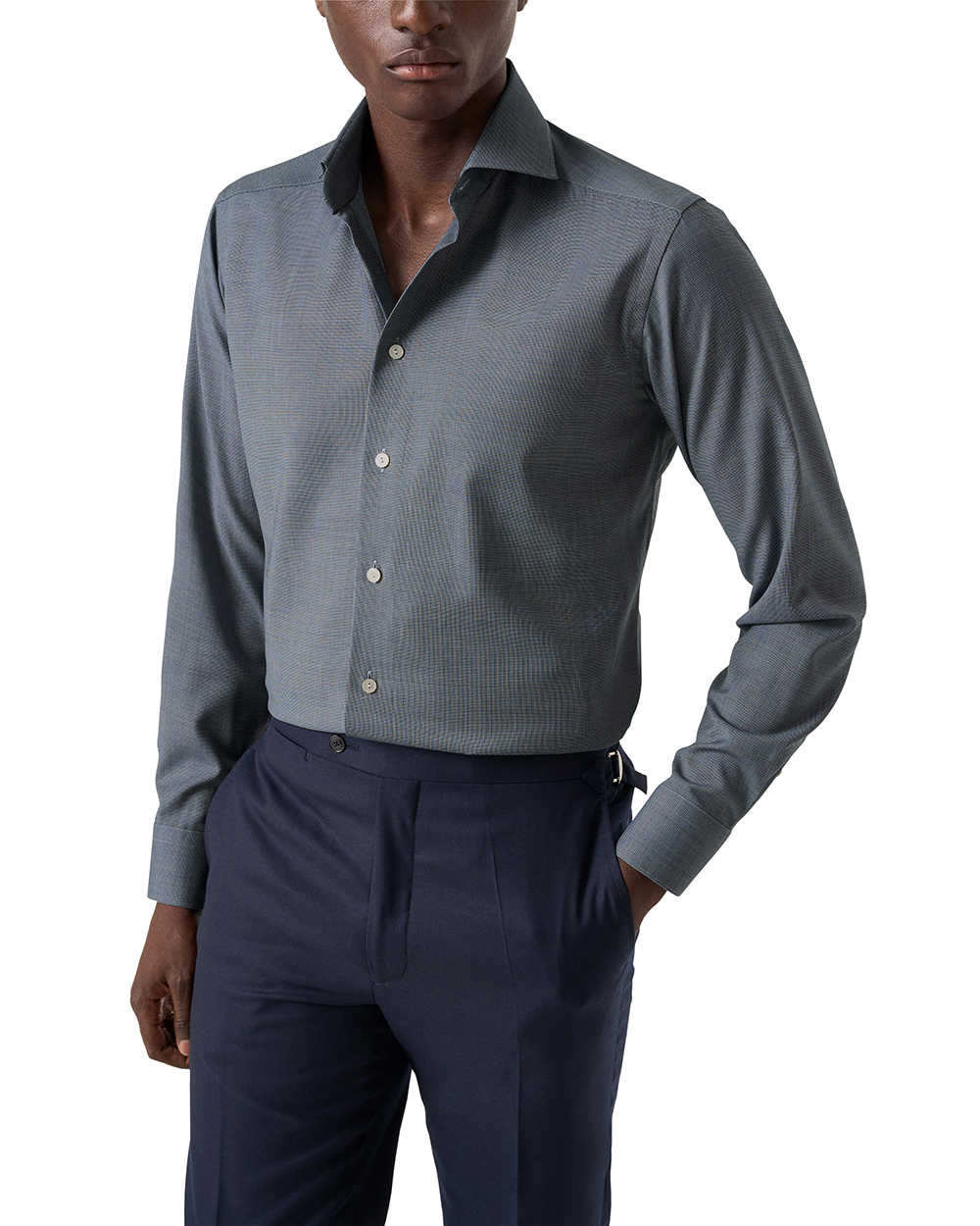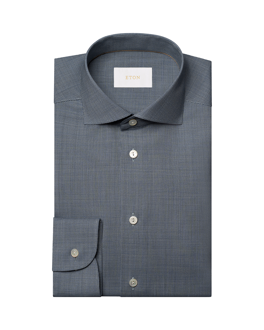 Eton elevates everyday style with this contemporary fit shirt, tailored in 100% fine merino wool for a luxurious balance of softness, breathability, and natural stretch. Designed with a wide spread collar and rounded single cuffs, it offers a modern yet timeless silhouette. The blue adds depth and versatility, making this piece equally at home under tailoring or worn on its own. A sophisticated expression of Eton’s commitment to innovative fabrics and impeccable craftsmanship.