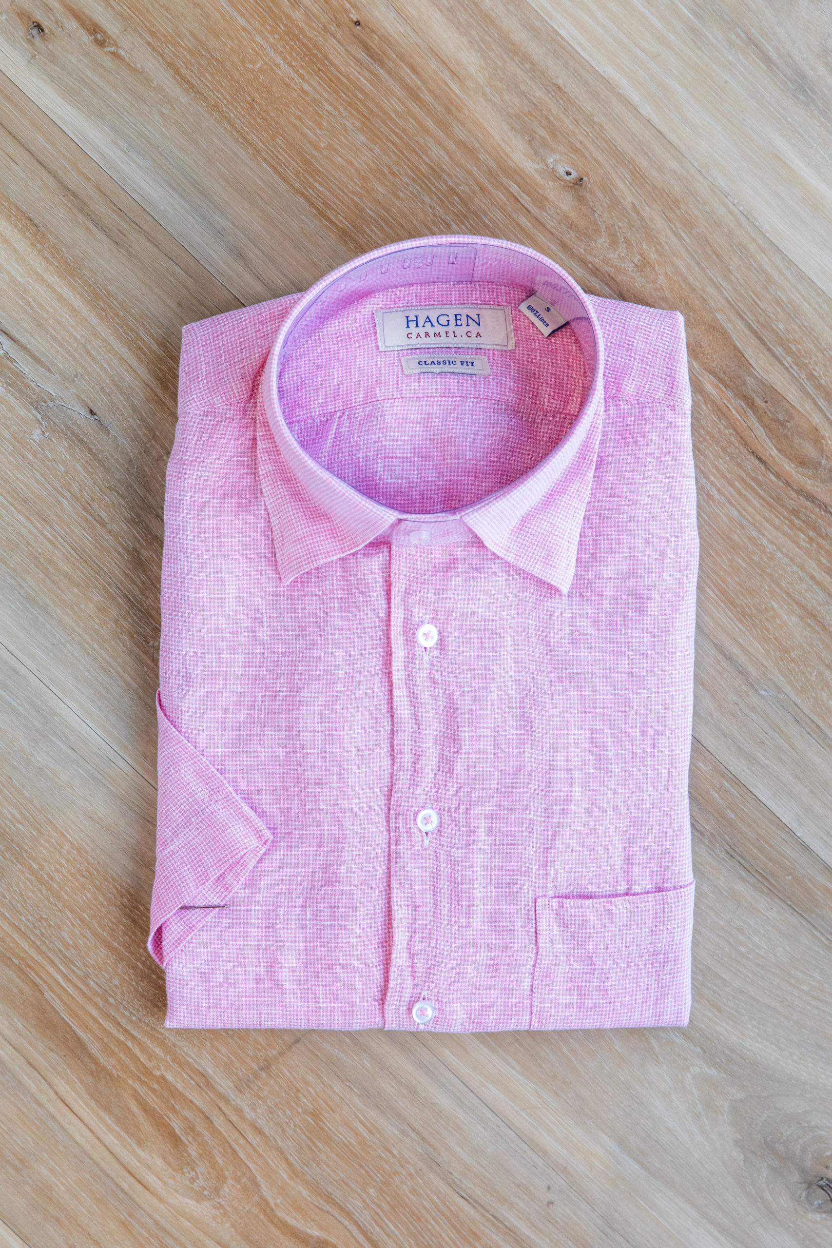 Washed linen shirts by Hagen are light, easy and airy. Soft prewashed 100% linen with subtle mini-check. Hidden button down collar, long sleeves and one pocket. Perfect for the summer!