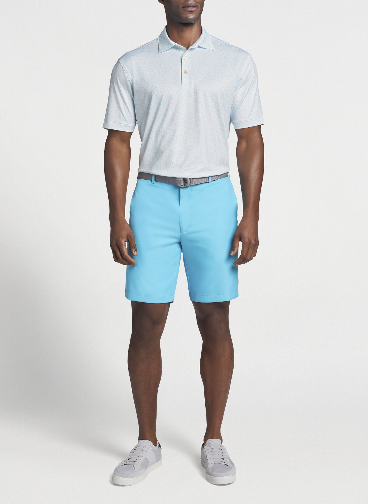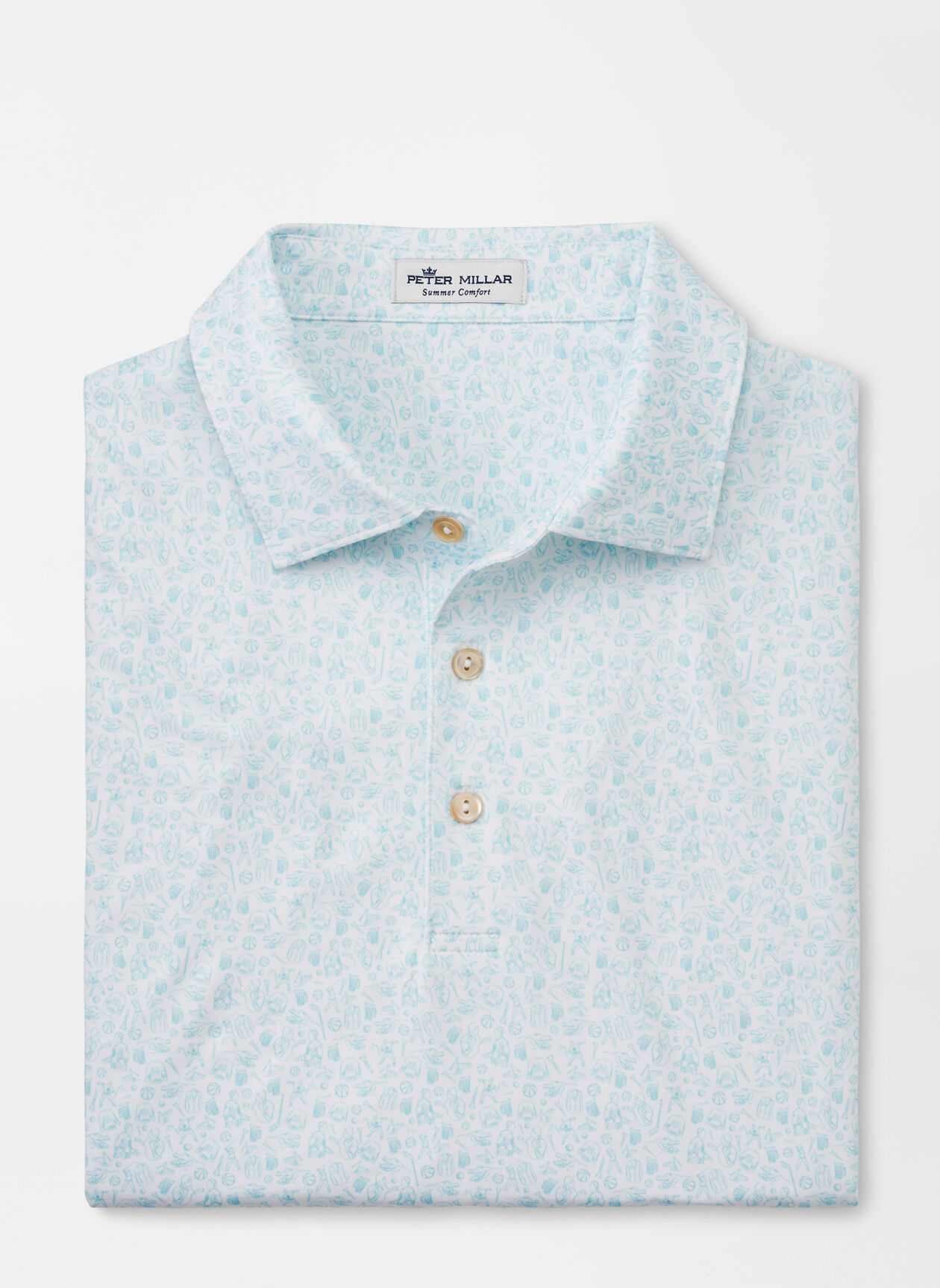 Enjoy all-day comfort wherever your activities take you in this signature Peter Millar performance polo. It’s crafted from an antimicrobial jersey fabric that delivers moisture-wicking, UPF 50+ sun protection and easy-care benefits. Four-way stretch offers optimal mobility during your next round. This shirt features a custom print hand-designed in their Pilot Mill studio inspired by a classic 90’s comedy. Finished with a Sean self-fabric collar and three-button placket.