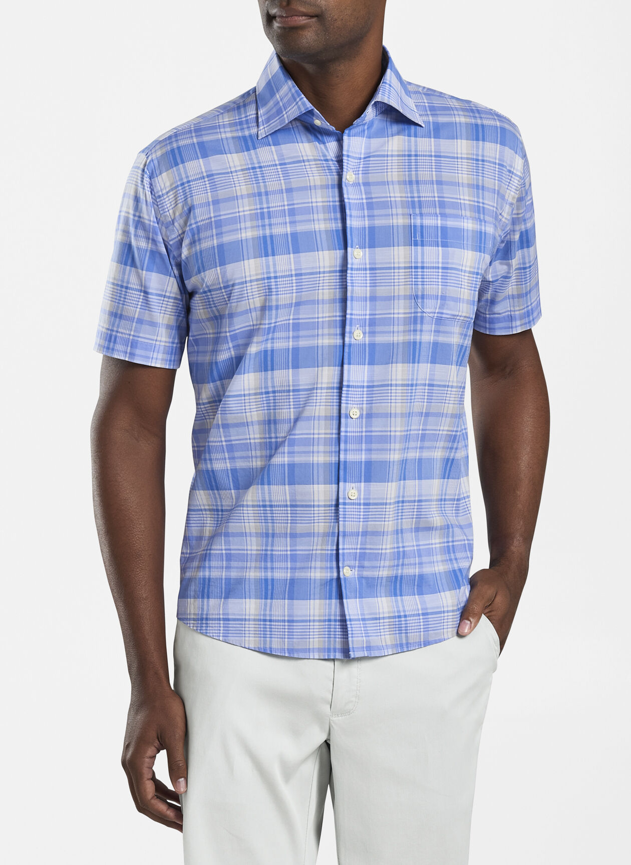 This short sleeve Crown sport shirt is designed to echo the familiar, lived-in comfort of your favorite summer sport shirt while keeping you looking sharp. It’s made from an exceptionally soft cotton blend that offers lightweight comfort and ideal breathability, with two-way stretch for optimal mobility. It’s designed with a classic plaid pattern and finished with a spread collar, French placket, chest pocket and double-button barrel cuffs. Style: MS21W13CFS