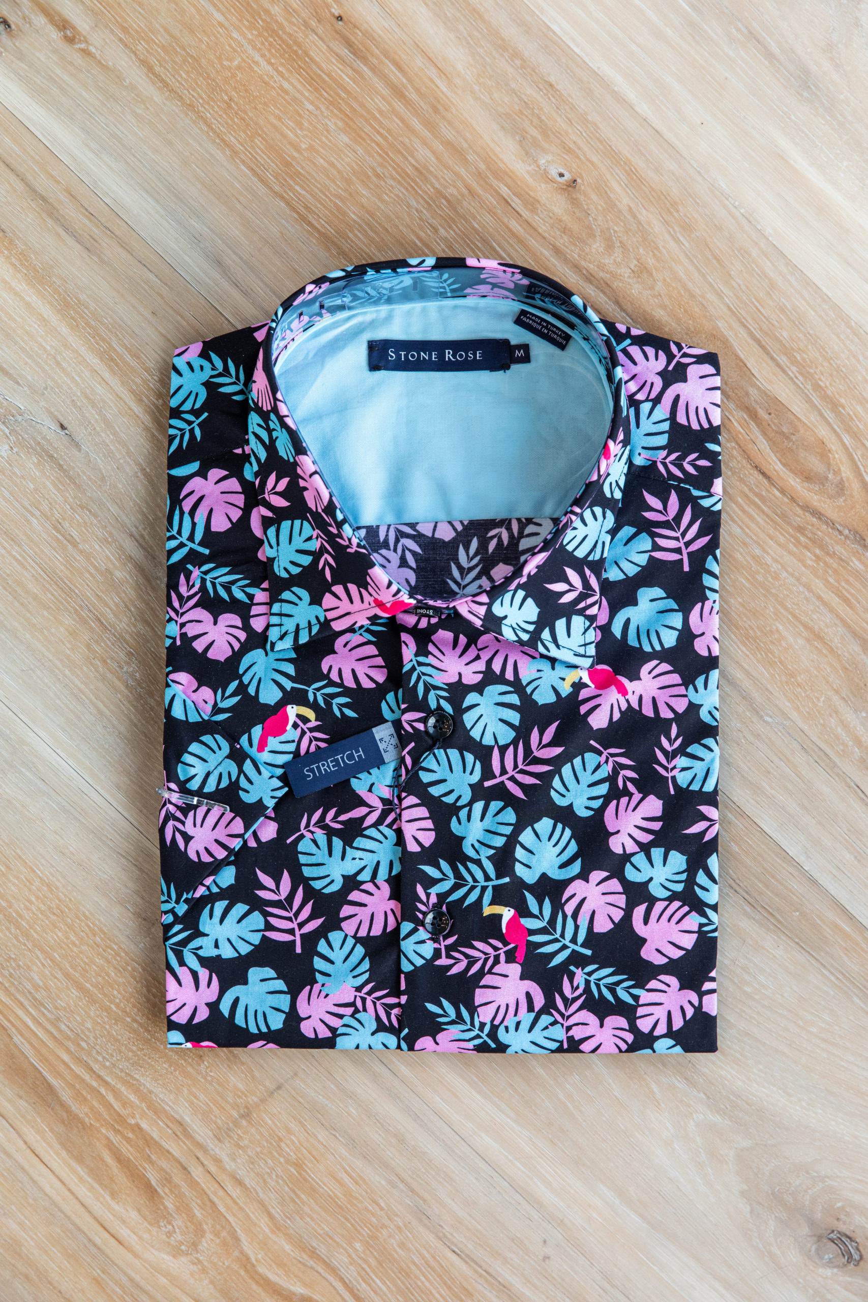 Get all the performance benefits such as faster moisture wicking and quick dry properties without losing the natural feel of cotton. Stone Rose Dry Touch® fabrics are breathable and have been engineered to provide a supreme level of comfort. These technical short sleeved jersey knit shirts come in a variety of prints designed in-house and feature a modern resort collar and chest pocket, offering our unique take on summer trends.