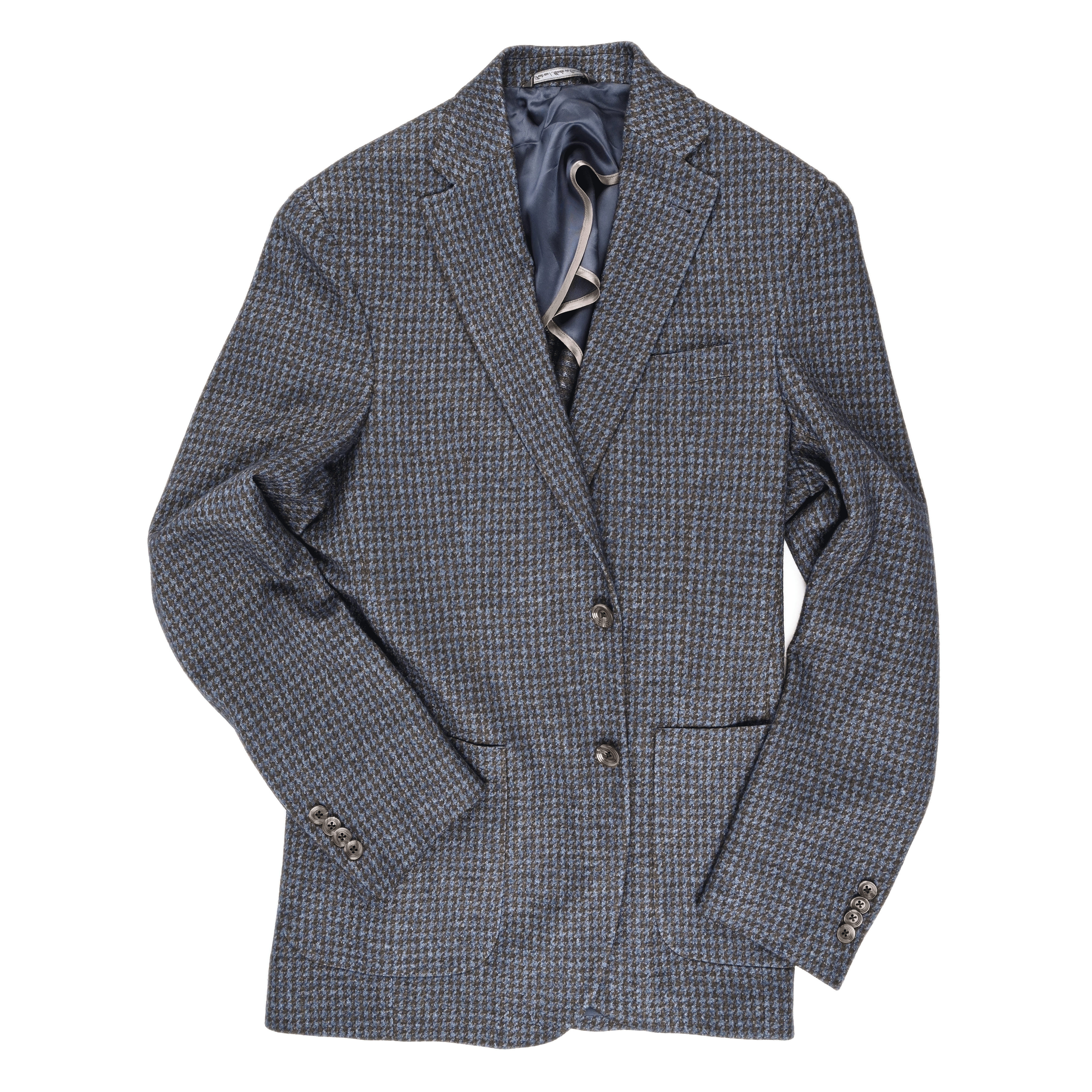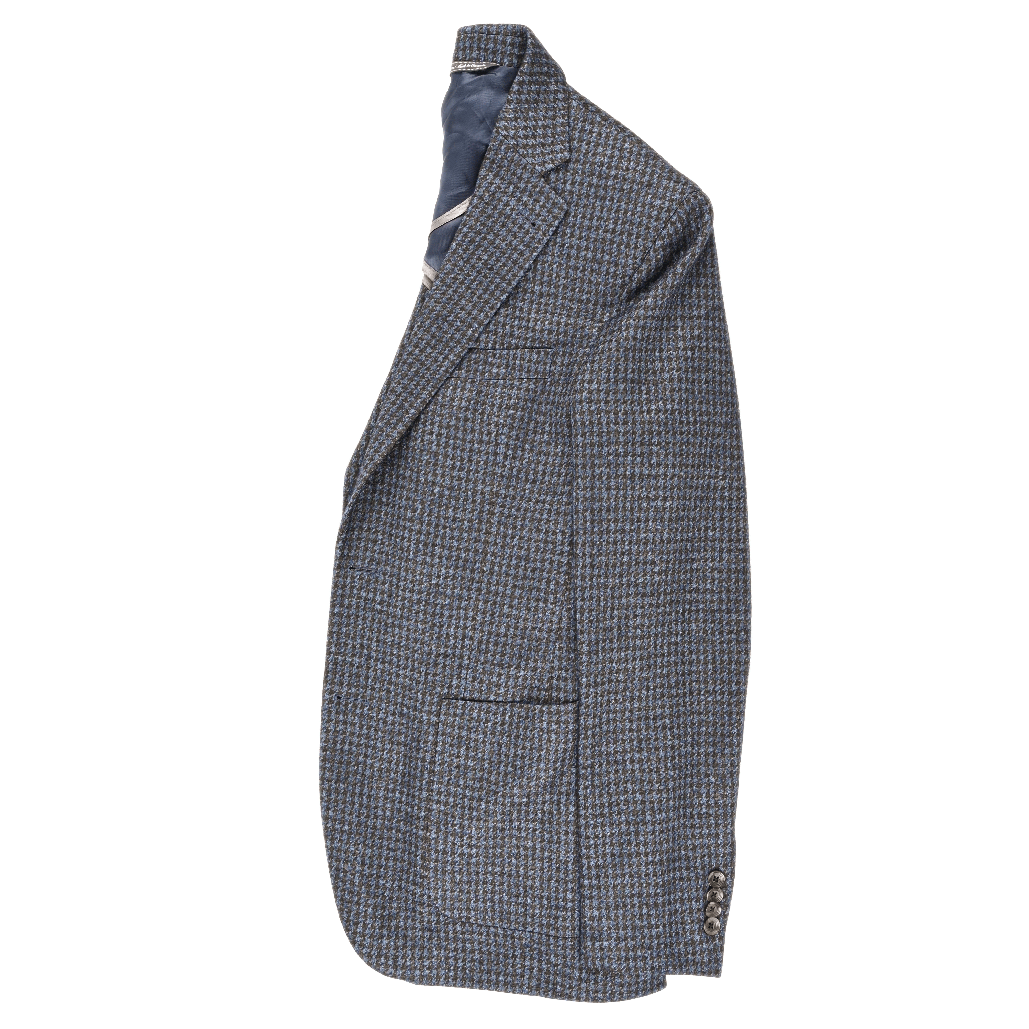 Refined elegance meets unparalleled comfort in this luxurious blue houndstooth soft coat. Crafted from premium cashmere and silk, the fabric is expertly woven in Italy to create a sumptuously soft and lightweight texture that exudes sophistication.