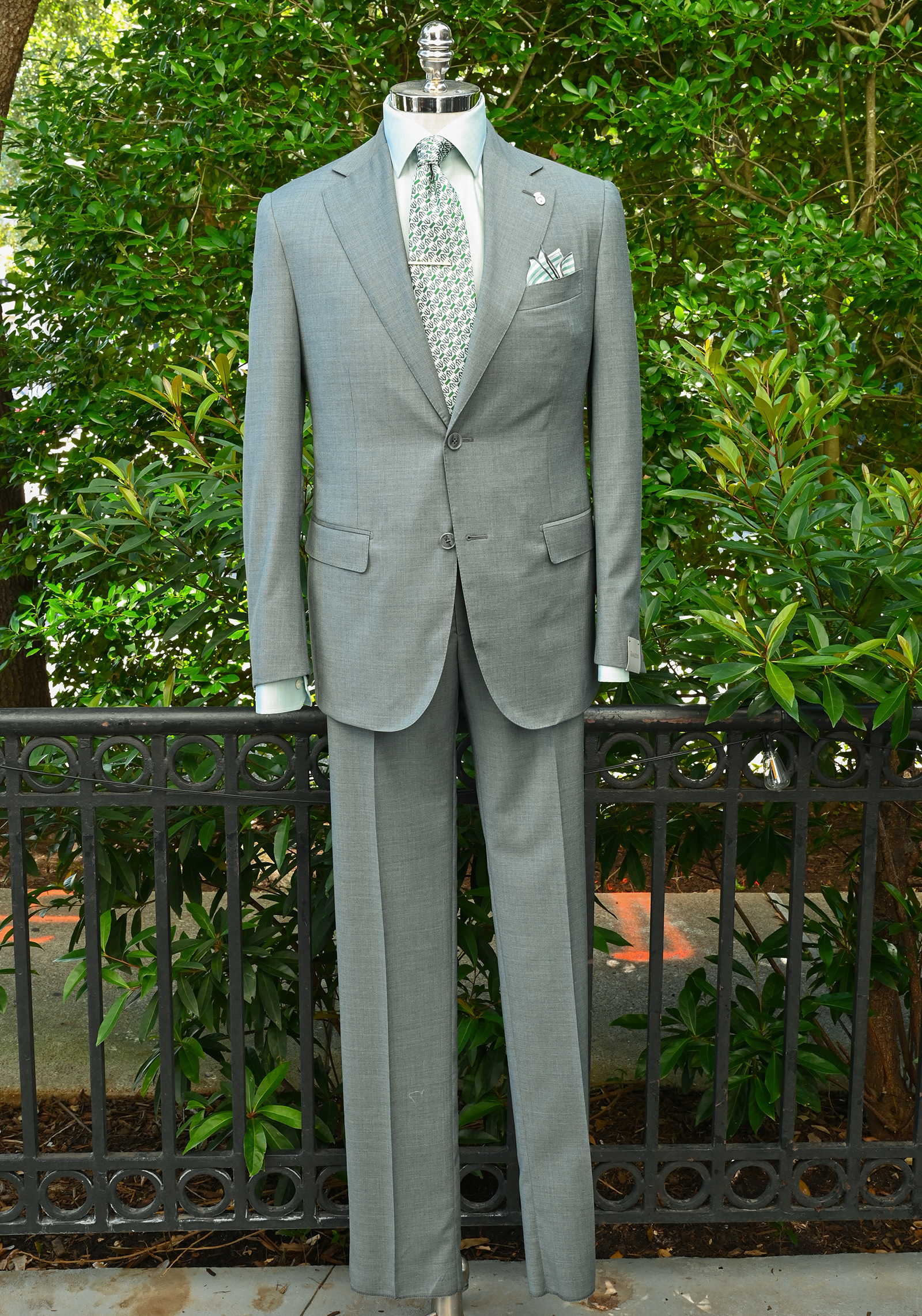 The fabric presents a stunning sage green hue, offering a subtle twist on classic suiting. This muted green tone brings depth and freshness, while remaining versatile enough for business or spring/summer formal events. Its lightweight, breathable wool construction ensures comfort and structure in equal measure.