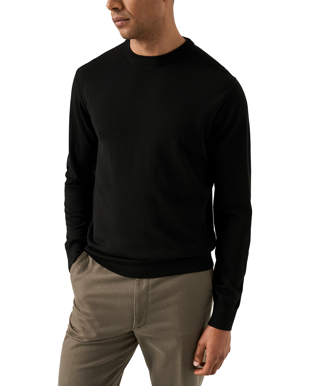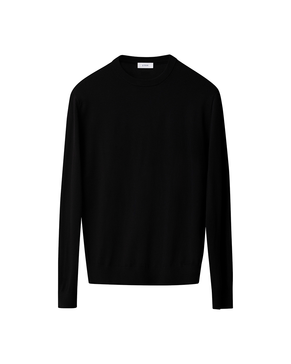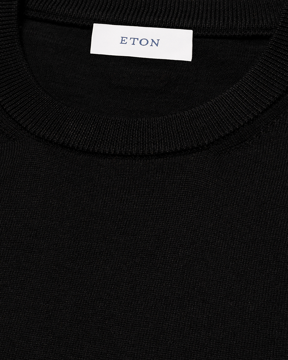 Timeless and versatile, this long sleeve crew neck knit from Eton is crafted from 100% premium merino wool. The fine knitted collar and solid black design create a clean, modern look, while the lightweight wool offers natural breathability, softness, and warmth. Perfect for layering under a tailored jacket or wearing on its own, this refined knit delivers effortless sophistication and everyday comfort. A wardrobe essential that showcases Eton’s dedication to elevated menswear, available at Norton Ditto.