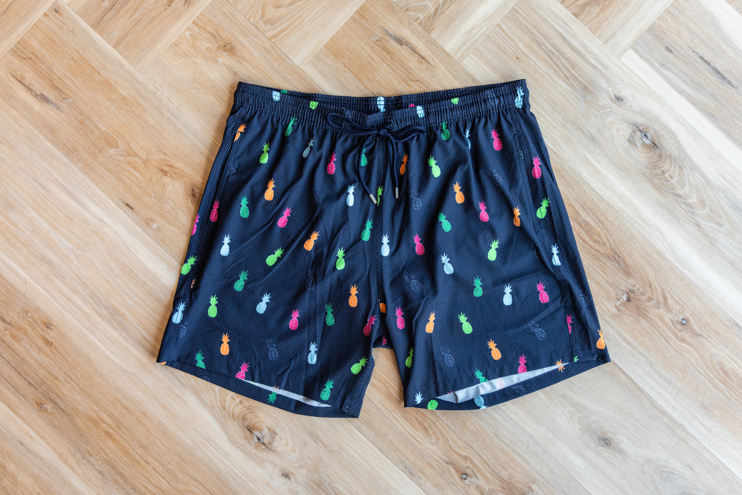 A selection of printed trunks made with fabrics that dry quickly once out of the water and printed with fade resistant dyes that can handle the sunniest of days. The following selection of trunks are made to pair with their matching top, but sold separately. They feature a draw cord elastic waistband and pockets with embroidered holes to let water out. Navy pineapple print.