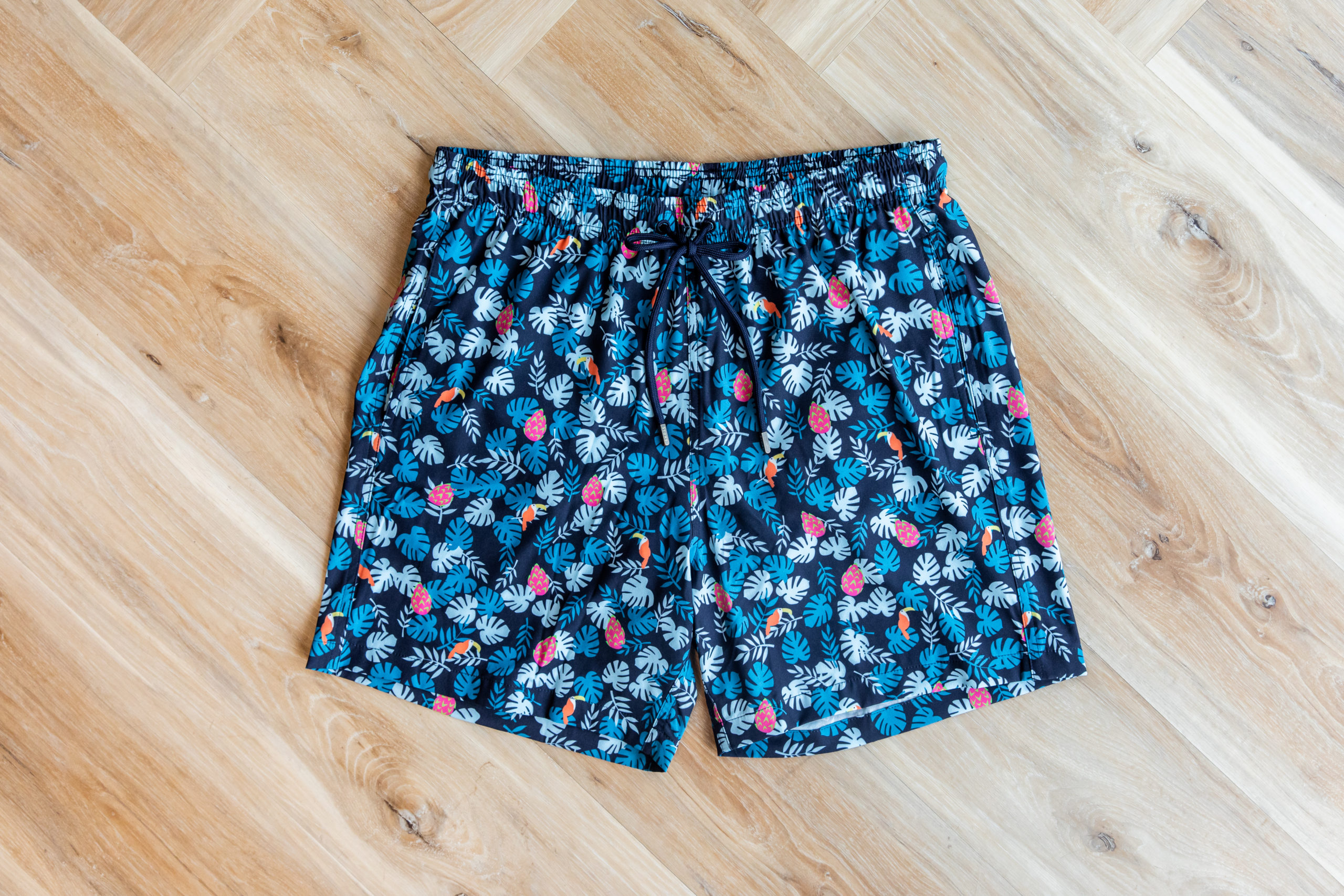 A selection of printed swim trunks made with fabrics that dry quickly once out of the water and printed with fade resistant dyes that can handle the sunniest of days. Stone Rose swim trunks feature a draw cord elastic waistband and pockets with embroidered holes to let water out. Parrot print.